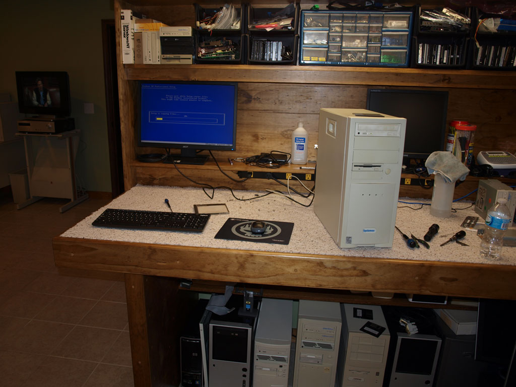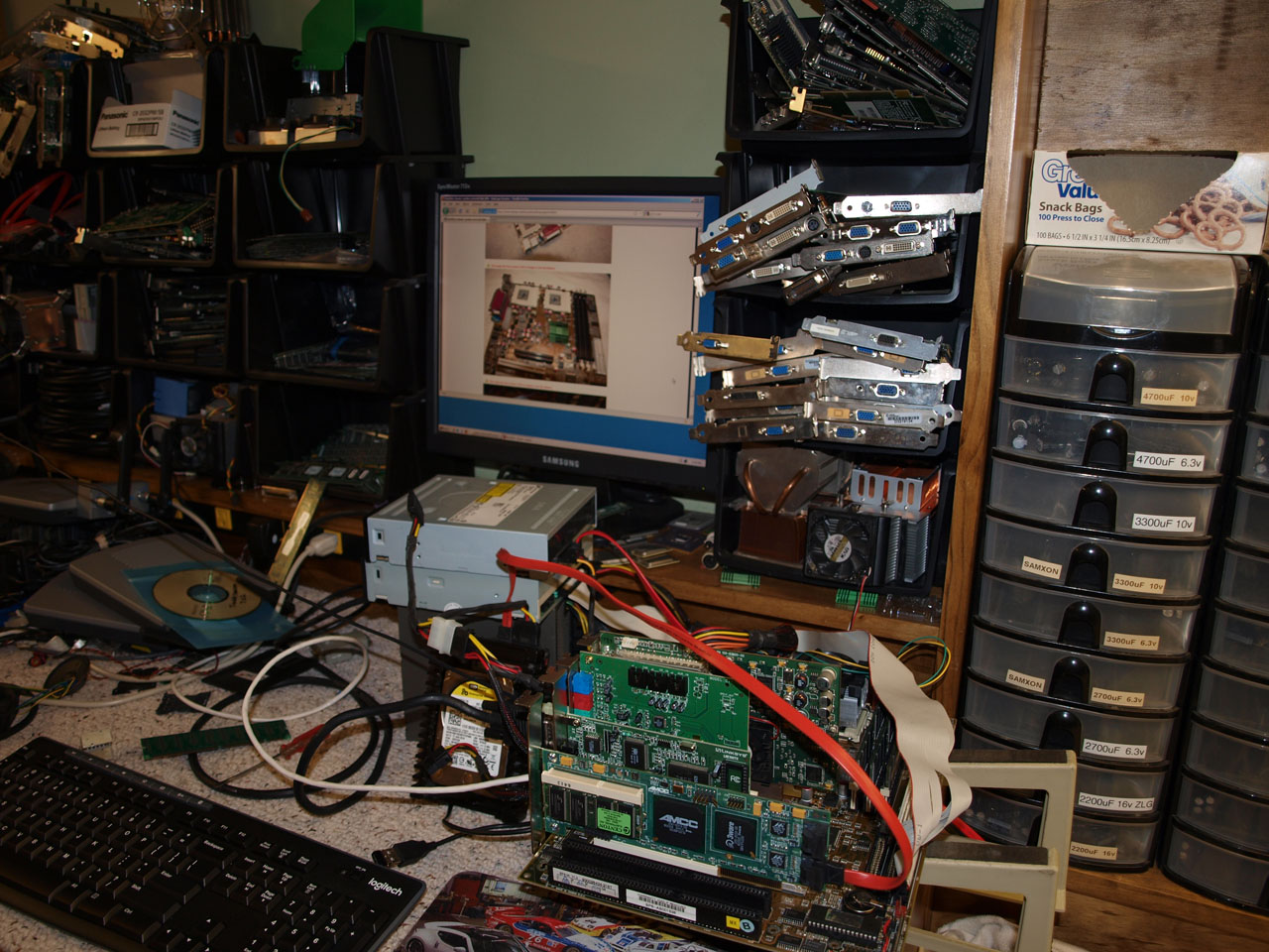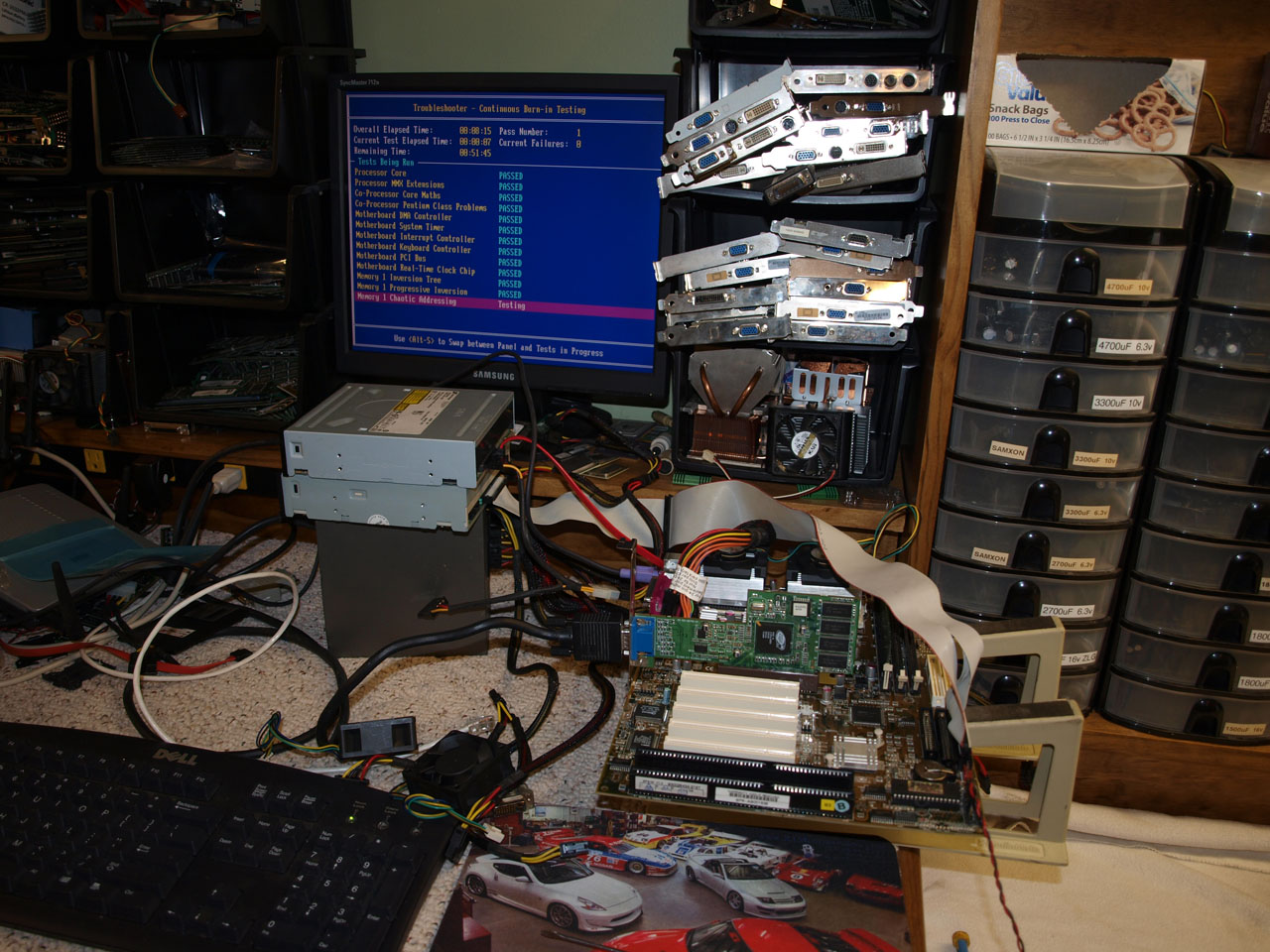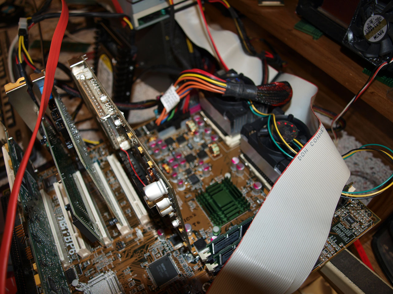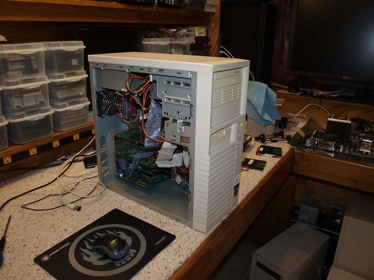 I've begun the ground work for yet another classic retrobox, the legendary Abit BP6! I bought this off ebay, seller claiming there was a pair of 300A's in it....well, they turned out to be 366's... I didn't discover this until I completely recapped the board, so sending it back for a refund is out... I'll either get a partial refund and leave positive feedback, or get nothing back, and he'll get a ripe one... I do happen to have a pair of 300A's from another deal though, so the project moves forward, but leaves another build in the lurch... I didn't pay much for this, so I'm not going to get too excited....but I really wanted the second set of 300A's, as they're very hard to find in a PPGA370 package, most were slot-1. It came with 768mb RAM (most supported by the board) a pair of Thermaltake 'golden orb' coolers, a NIC, and a SB Live sound card.