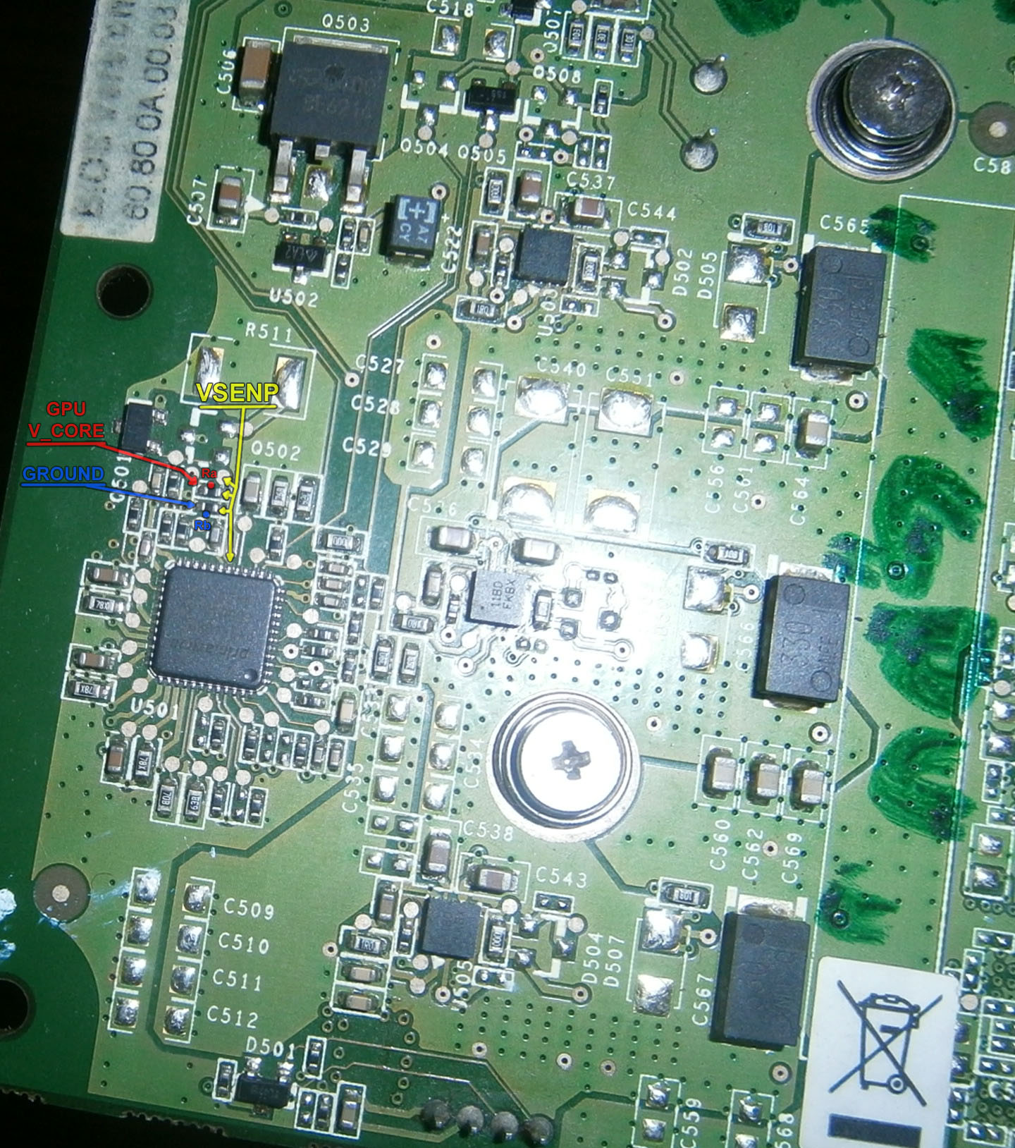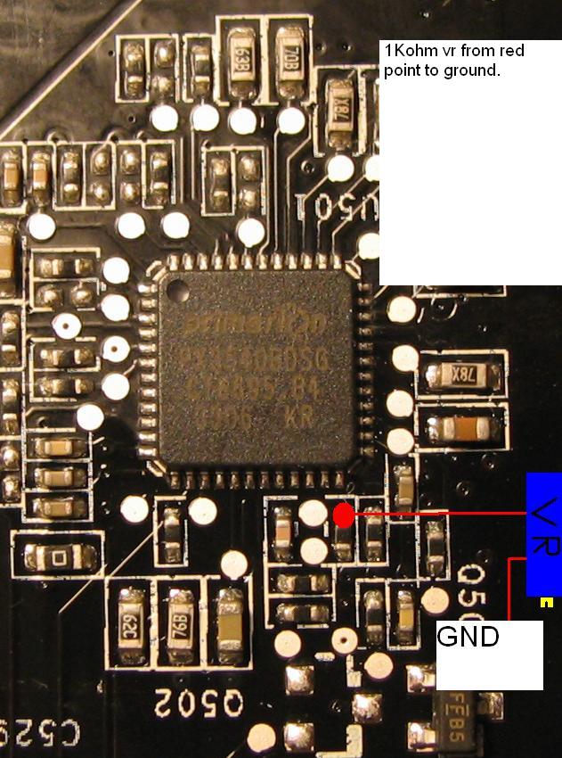Hi, I've been looking on the net for a way to undervolt this card with no luck, the bios only allows to set 1,1 to the v-core but I measure 1,27 and 1,89 V_men,( thanks to momaka for teling me how). All I can find on the net is how to overvolt, but it seen already factory overvolted because with the stock cooler it overheats while on desktop.