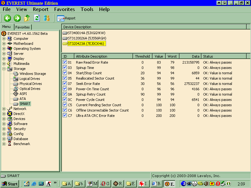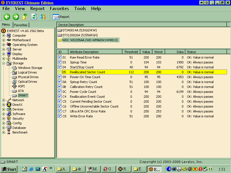 PS 2: What pcbonez meant when he said that SMART is smart is that the "worst" value is not set in stone. I used to think it coudn't go up, not even if the HDD performance changed for the better. For example: let's say your IDE data cable is broken, and that the SMART CRC errors parameter is is showing a malfunction. In that case, the "worst" value will be low... lower than the threshold. You realize the data cable is the culprit, and you change it. According to pcbonez, given enough time, SMART will realize things changed for the better, and will change the "worst" value to a value above the threshold.