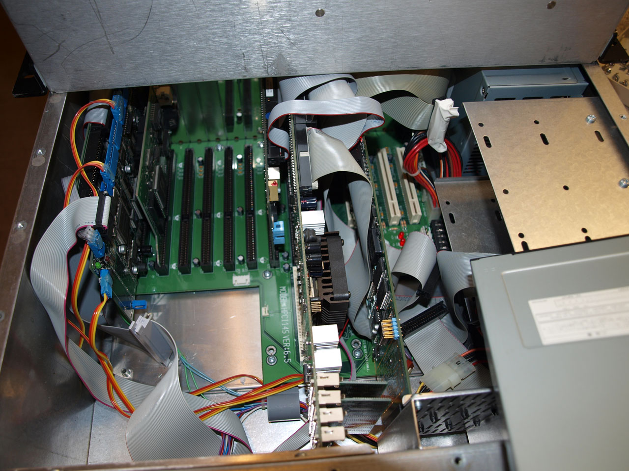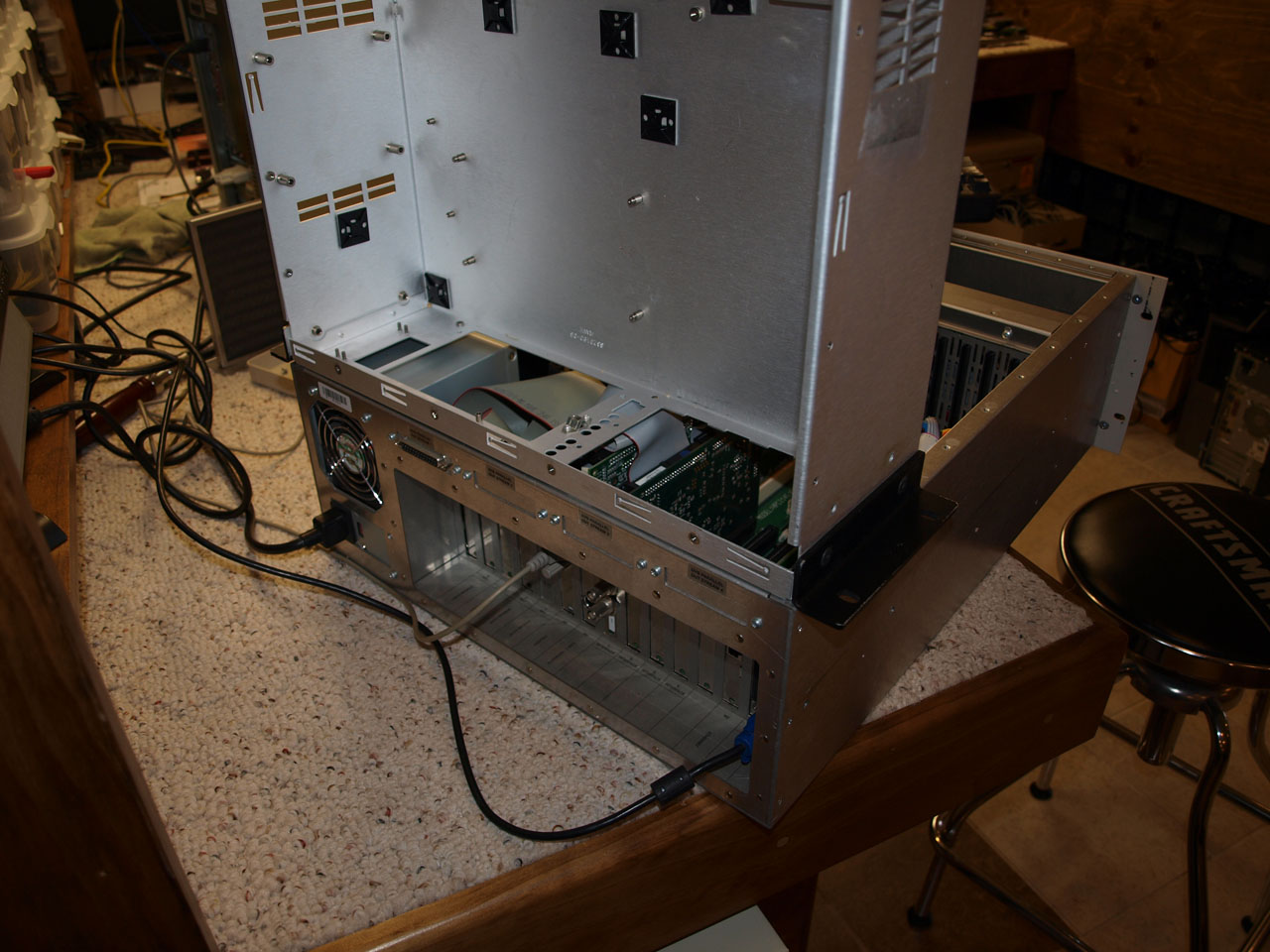 I picked that up on ebay for the cost of shipping (don't worry brethin, I'm still in the black by a good $160 for this project), the seller had no idea what it was....hell, I'm not really sure what it is, I was more interested in the case.... There's very little information out there about it....but it seems to be some kind of broadcast grade signal streamer from yesteryear (was made ~2001). Useless.....but inside there's a working 'system on a board' and its complete backplane. The system specs are a pentium classic @ 233MHz 256mb RAM. It's an Intel HX chipset, which can be ran up to 1gb. Whatever this thing is, has WinNT4 loaded on it.....but it'll run DOS with glee, even NT4 (obviously), which opens up some more possibilities with some modifications!