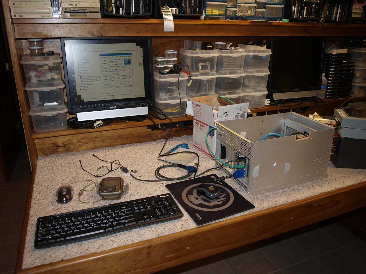 Now here's where this system gets good.... The G41 chipset on this board supports 5400-series 1333FSB Xeons without any firmware mods (Intel motherboards were really good about this), the only mod needed was to the chip itself so the LGA771 configuration would fit the keying for the LGA775. The next great thing is DDR3 support. Then add in that it has a legacy floppy controller & IDE so the thin floppy & DVDROM can remain functional, which is needed for this build.