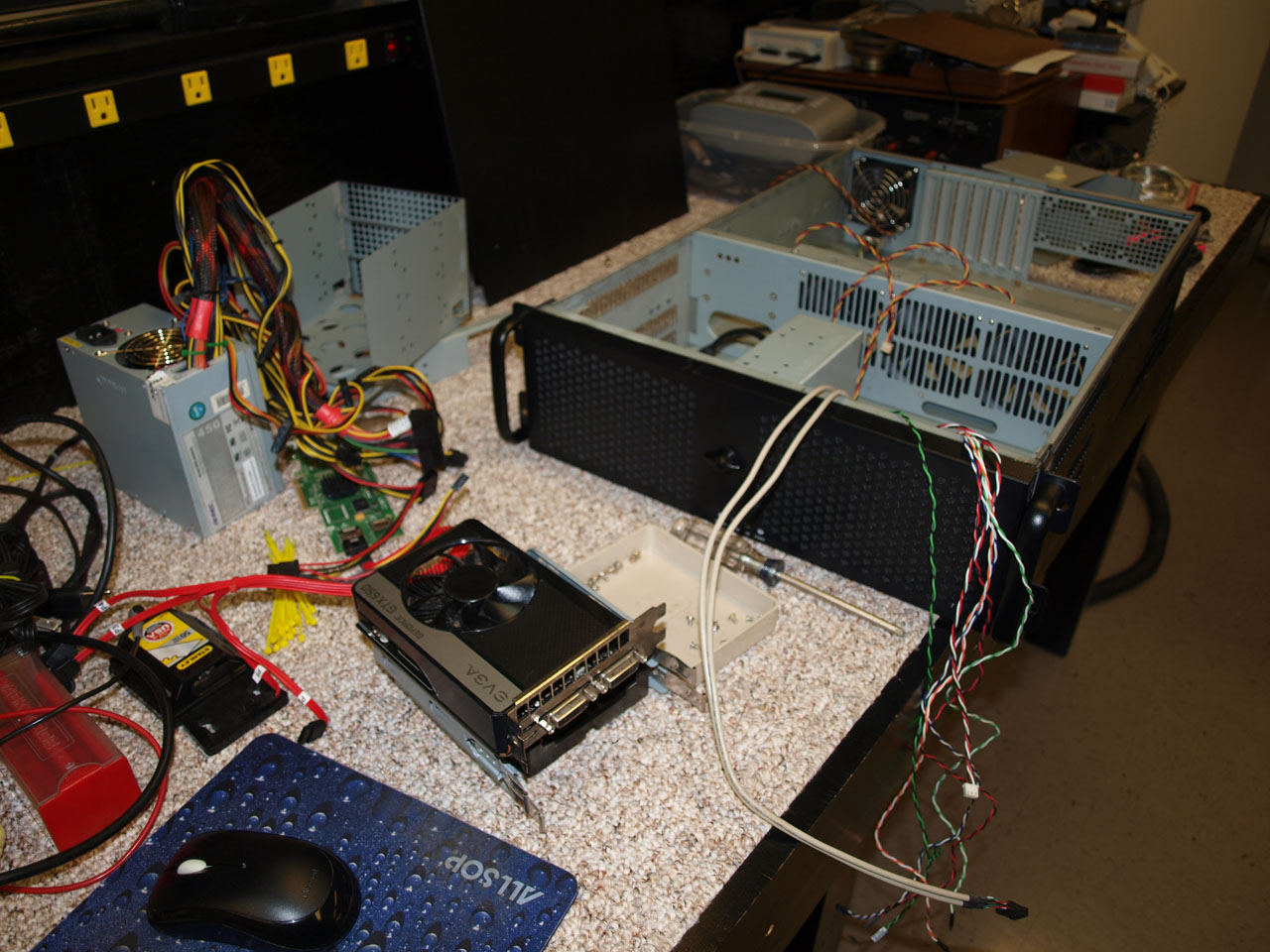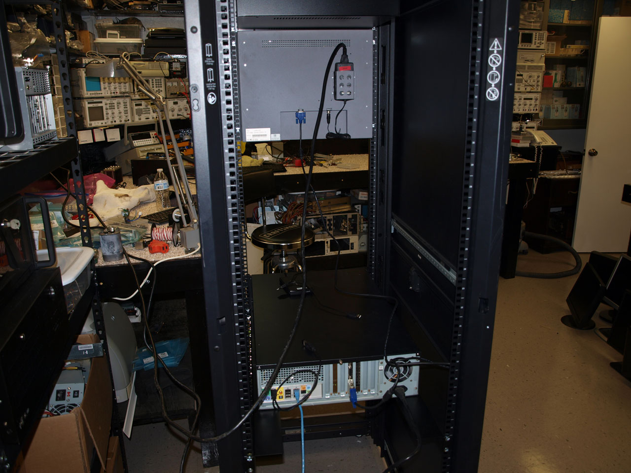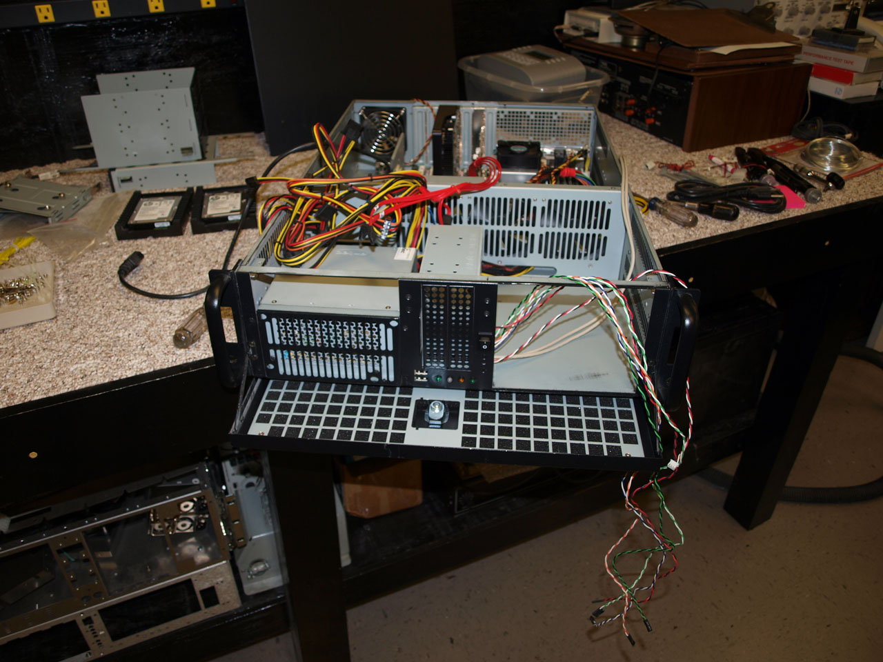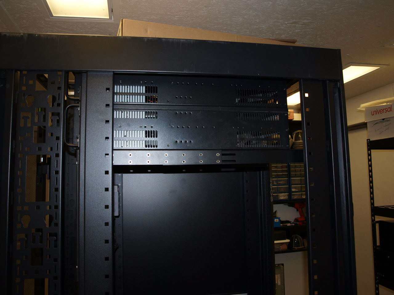 The Antec cases were moved 8U's below the display, leaving a space for the 7U 'creation' and a 1U for a keyboard/mouse drawer.