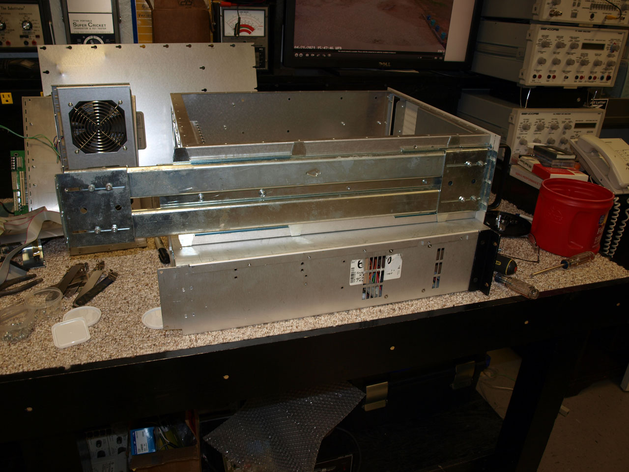 Now for some fun! I only got the male ends of the rails with this unit....and they don't match anything I have......so they got removed. Now I have to fit some very heavy duty 4U rack rails/slides to this case that KC8ADU gave me over 10 years ago.....but of course they don't fit the mounts on this case. I chose to modify the rails versus modifying the case, as the case had a good centralized setup for mounting.