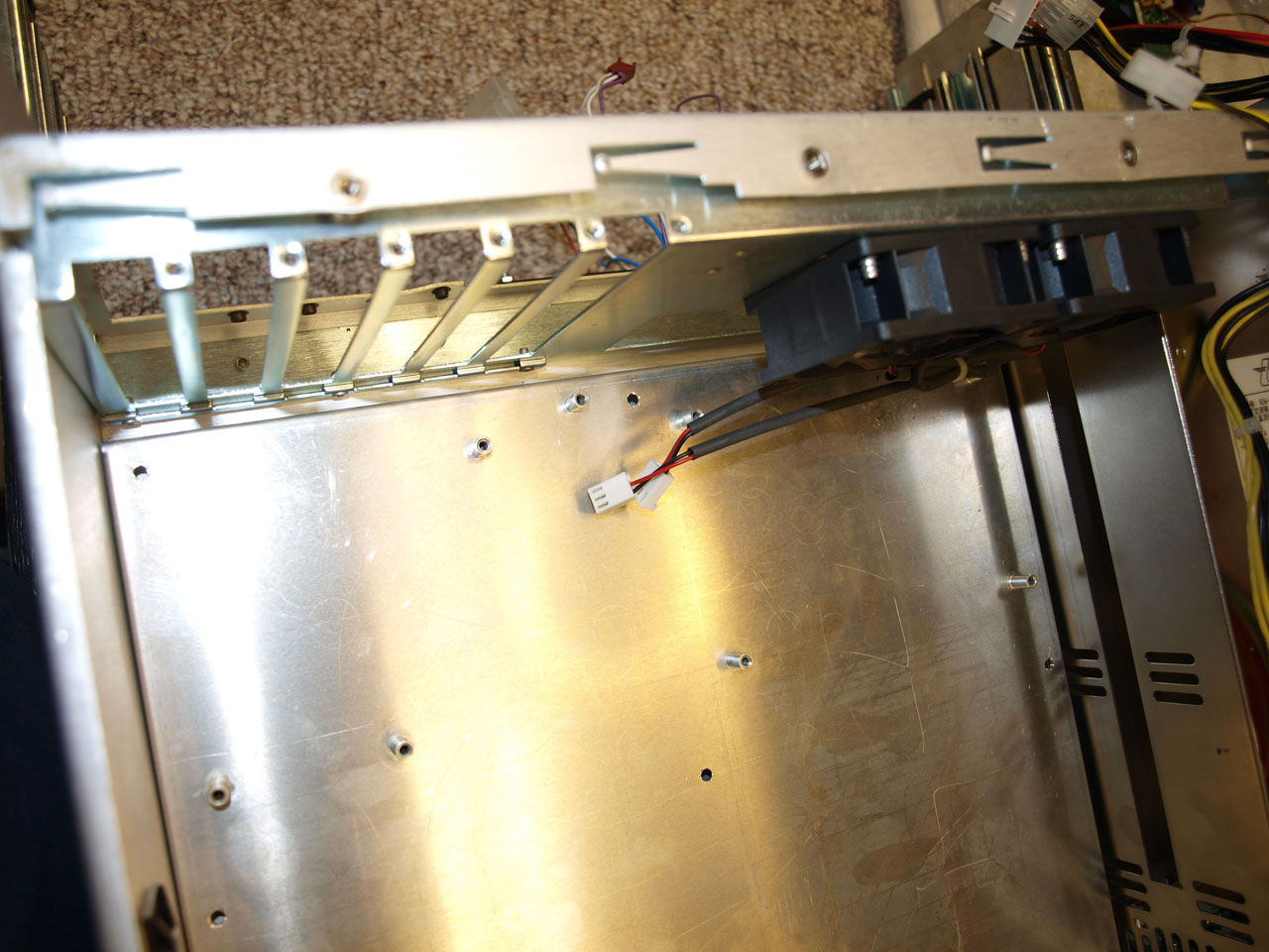 Along the bottom edge, I reused some of the old rivet holes that the card slot case (now removed) once used. I just widened them out to accommodate the larger screw...and of course drilled corresponding holes in the fan bracket.