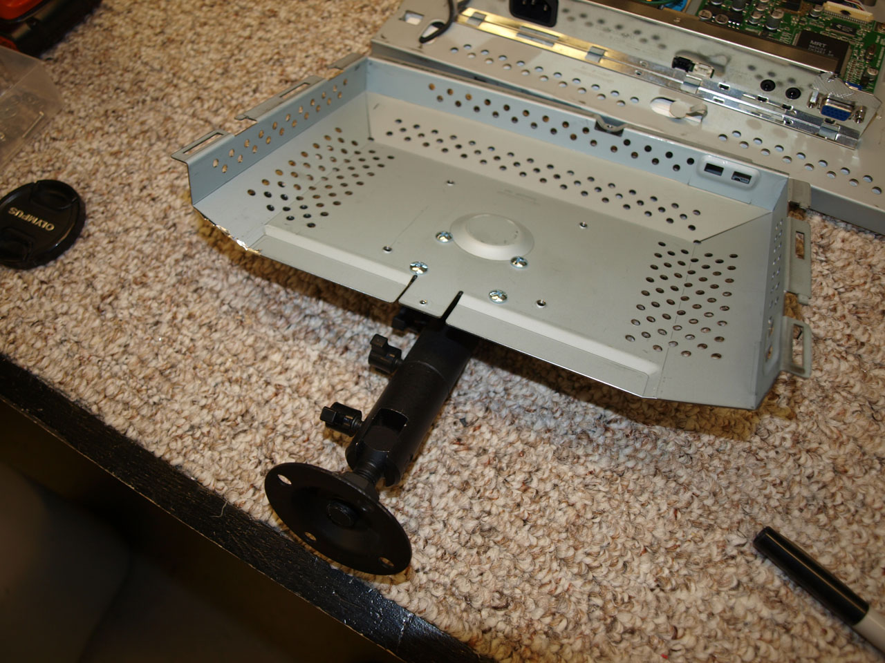 One of those pedistals attached. I'm sure you're wondering why I didn't just use a vesa bracket....well, I didn't have one....and when I looked, most I found were just too big & clumsy for what I need.