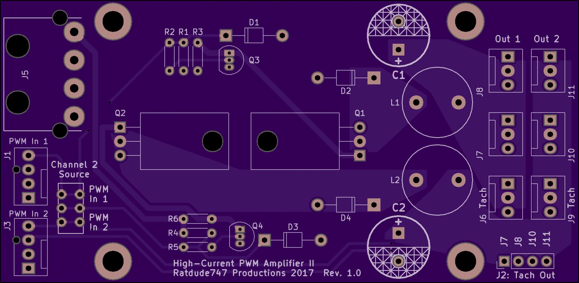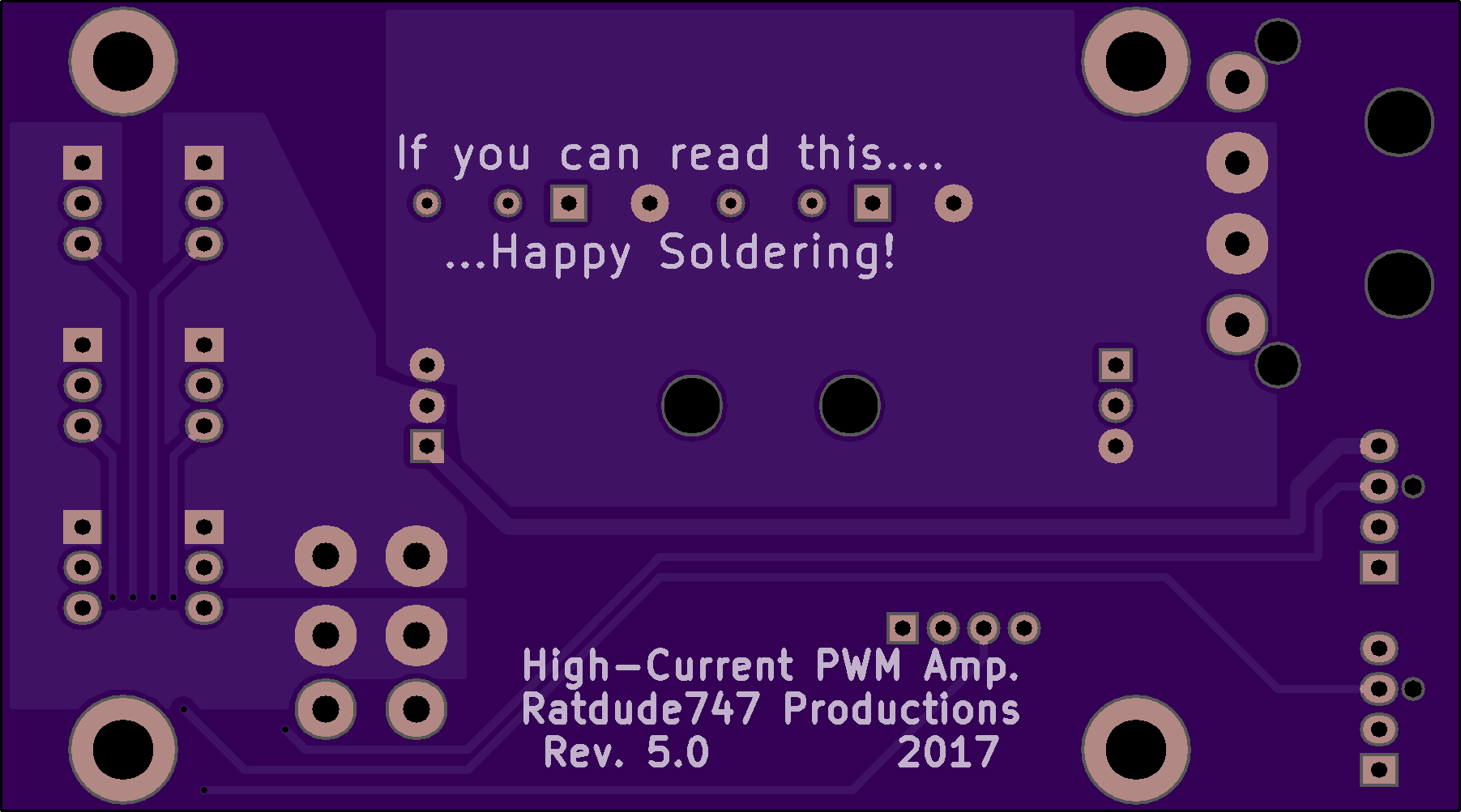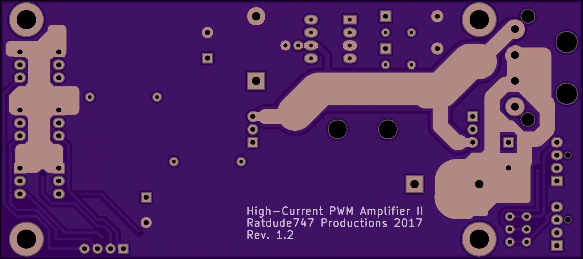 Also the board grew as did the screw pattern. Finally I axed the solder mask on the back side's current-dense areas to optimize things (I'll manually flow solder with my iron for the desired effect).