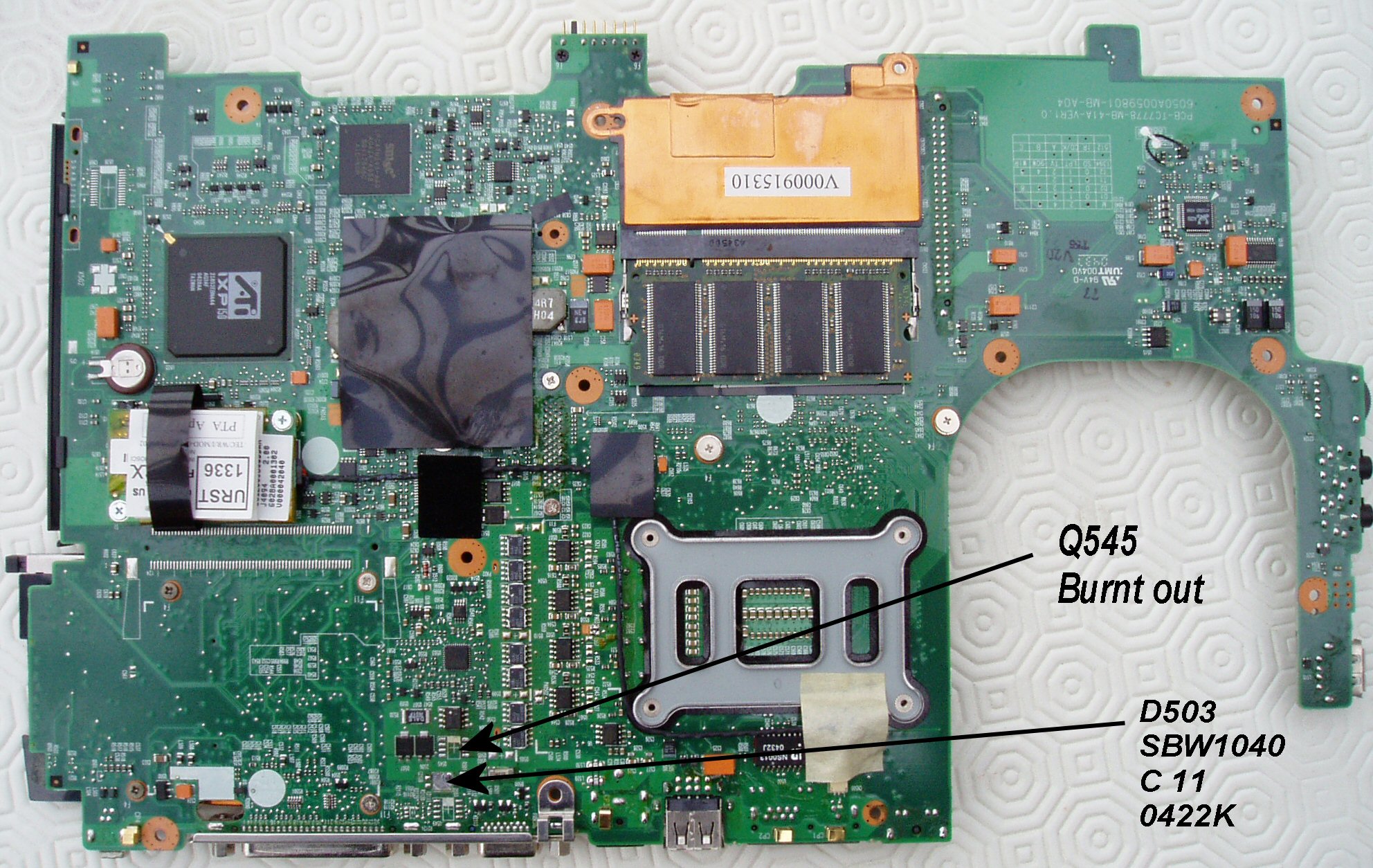 It had a s/cct on the power jack which was traced to Q545 being burnt out and also D503 being s/cct. That was the easy bit.