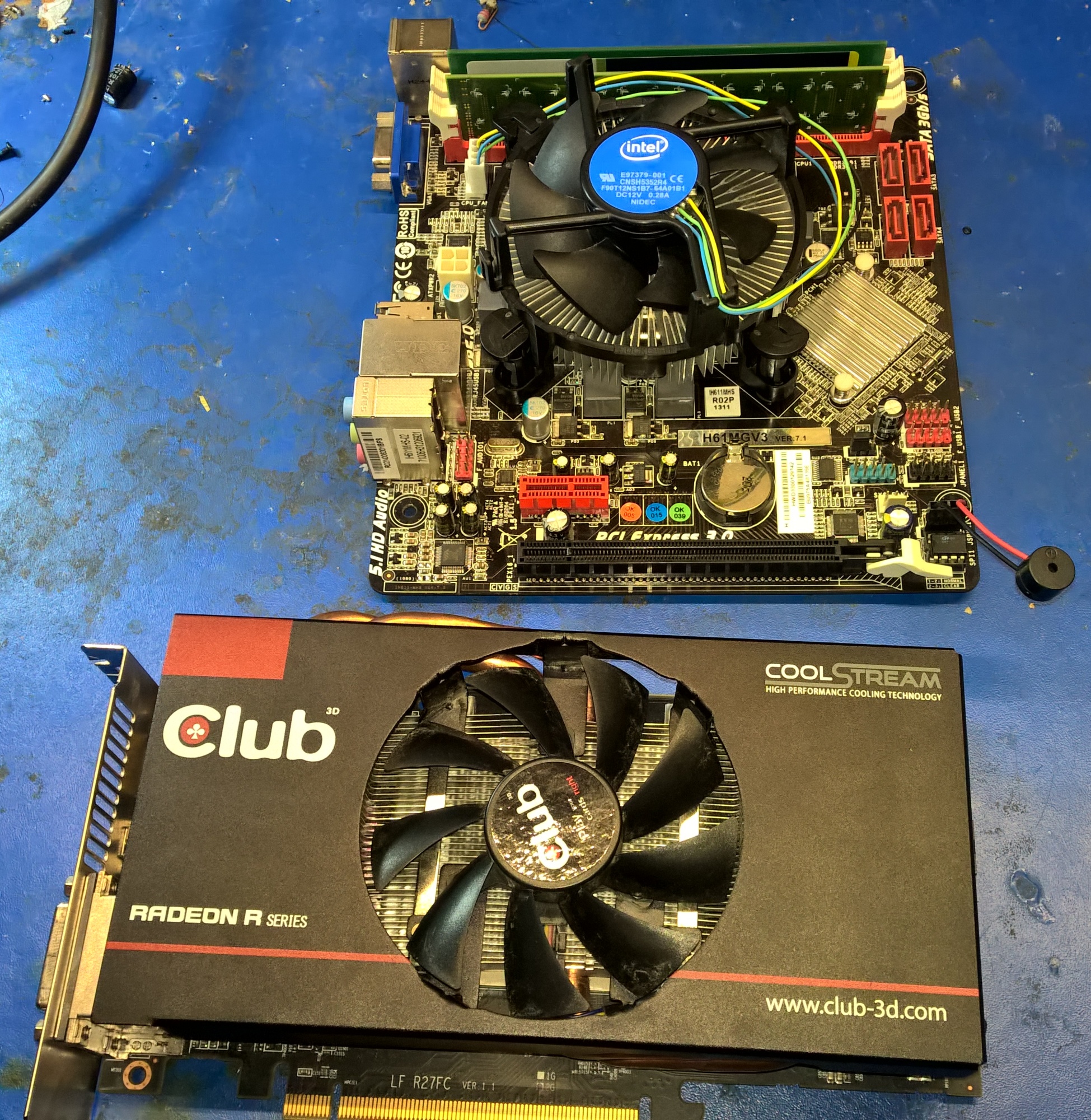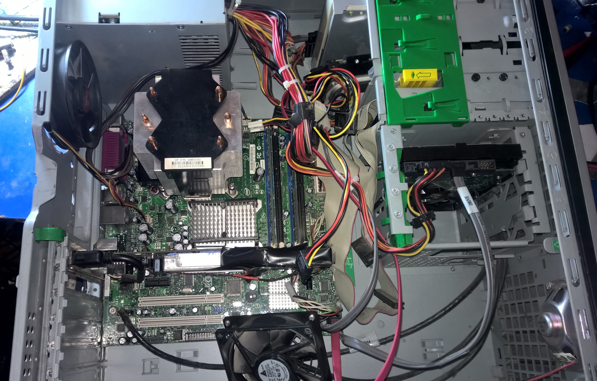 The whole thing is sitting into a HP dc7600 tower case and still using the original power supply - and that was again an upgrade of the old system i first found when i got there! Cutting the old I/O shield out, which was integrated with the motherboard tray, was a royal pain btw. I kept the very nice tower style CPU cooler by AVC.