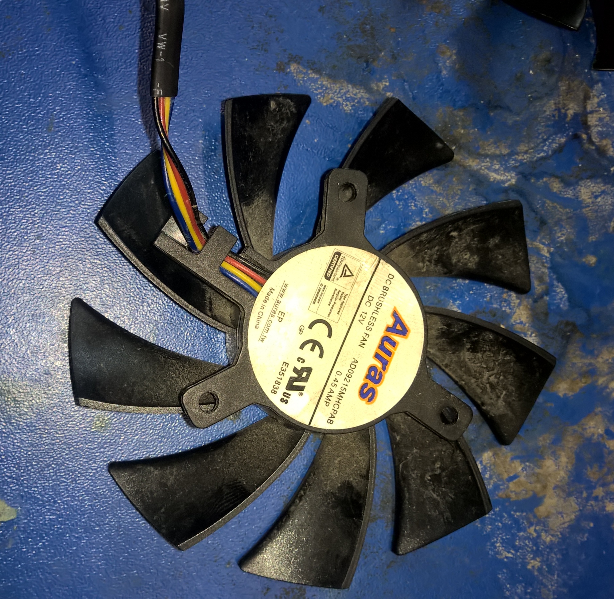 And my curiosity got the best of me - after trying a few other fans i had lying around, which were either a poor fit or not enough rpm to keep this thing cool, i poked my tweezers in the middle of the apparently sealed plastic casing of the fan on the Club3D R9 270X It actually revealed a conventional bearing which could be lubed! I no longer have to bear the grinding noise, yay!