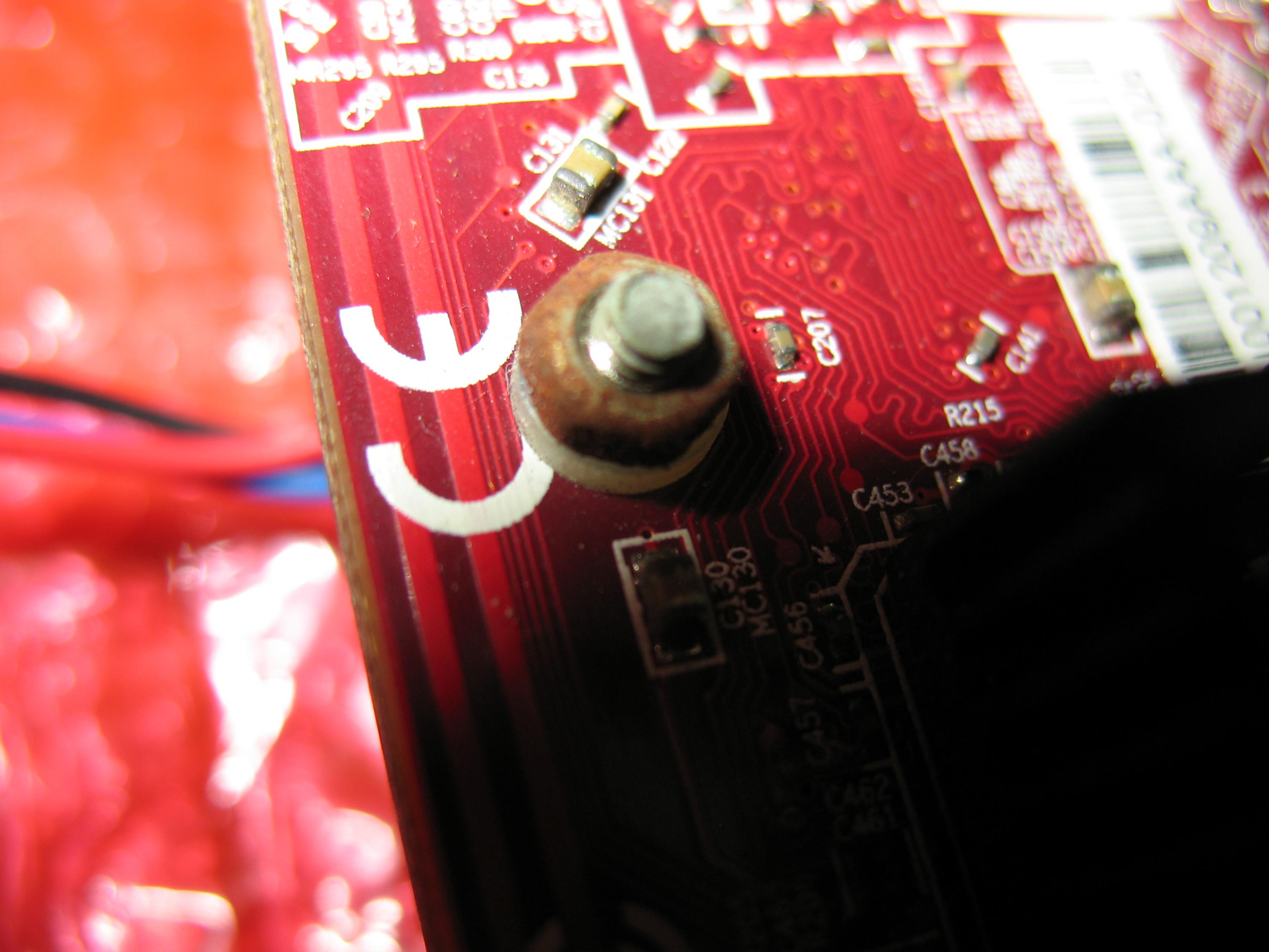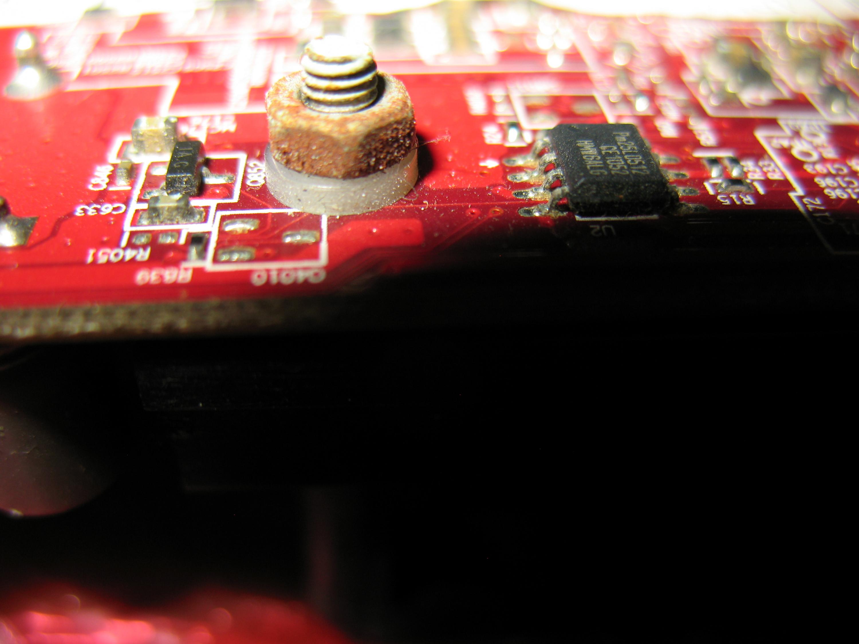 The new heatsink fit like a glove. I just needed to make minor cuts in two of the corners in order to get around various components on the board. Other than that, there wasn’t much else to this mod. Like many of the early Radeon video cards, screw distance is standard 55 mm diagonally for this card and only 2 screws hold the cooler. Speaking of which, here is what was under the original one: