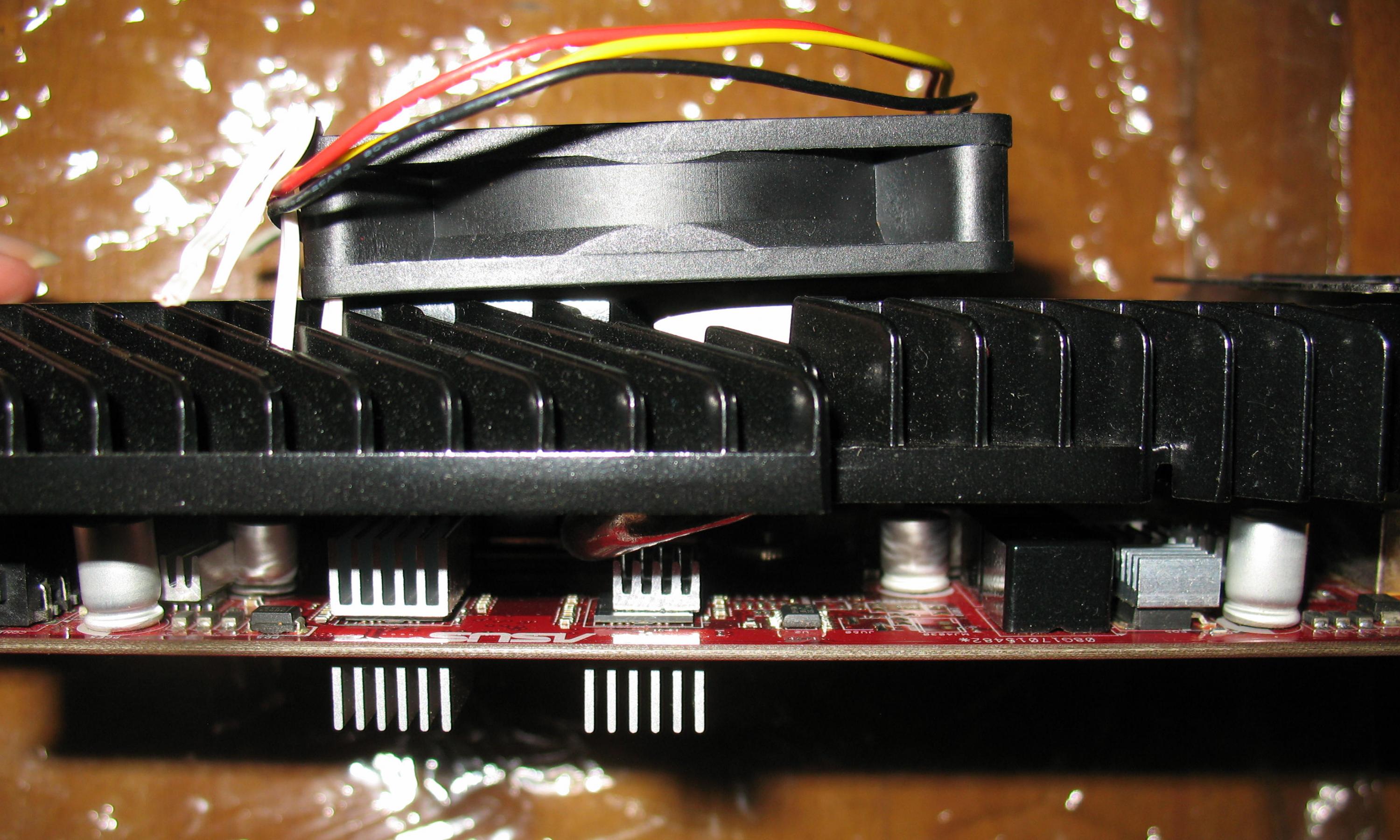 With the new heatsink I made above, the video card will still get pretty toasty without any fans or other active cooling, but not as much as with the stock cooler, thanks to the largely increased surface area. And adding even a slow-turning 80 mm fan running at 5V is enough to keep it cool.