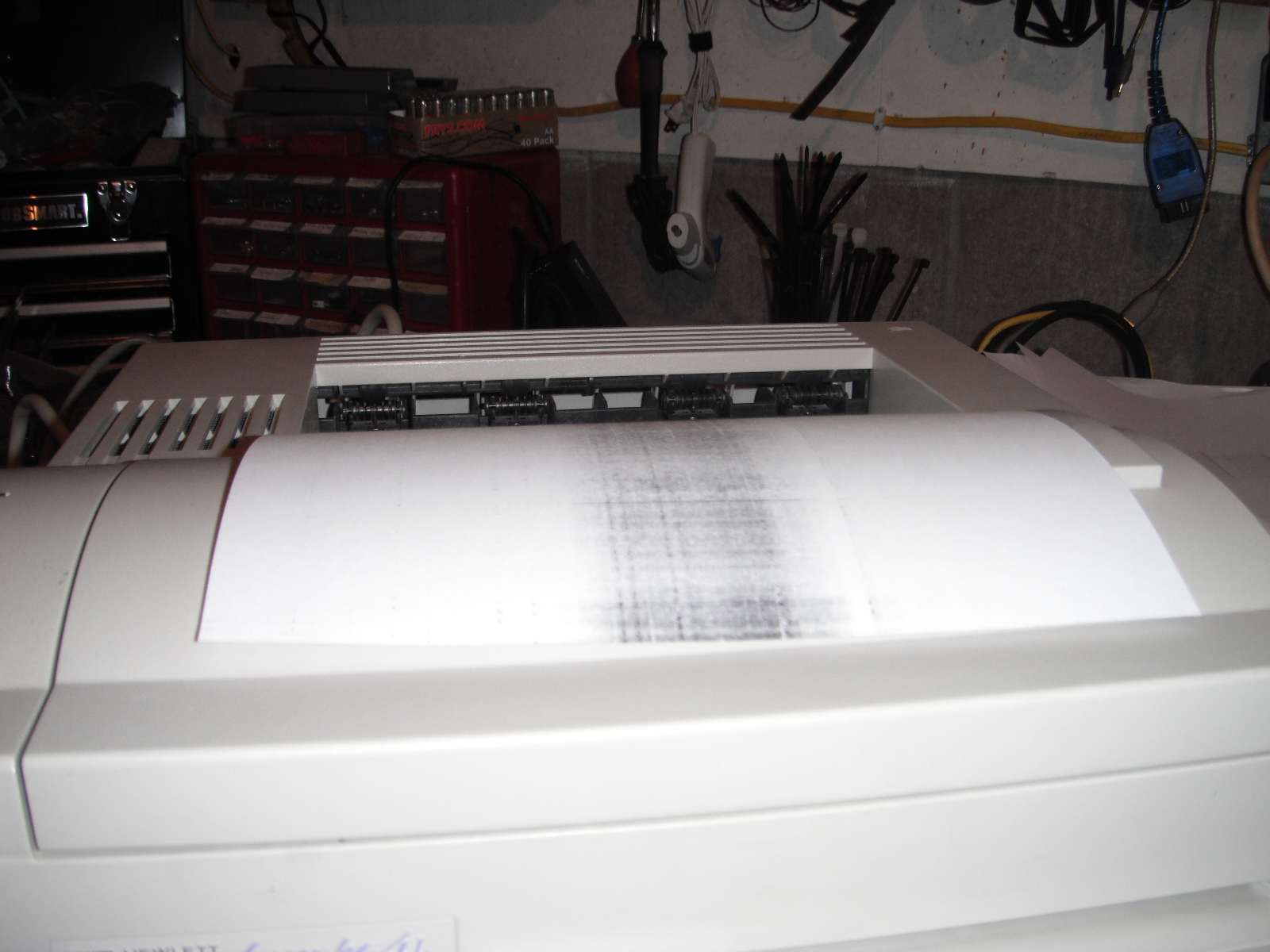 The old toner still works (mostly, see below) and I was able to fire it up, print a few test pages (which mostly worked, see below), and even attempted to print a test page from windows 8 (I think I had the wrong postscript driver as it printed but the page layout was dicked). Brought it home, and no bueno, she's not running. See this thread: