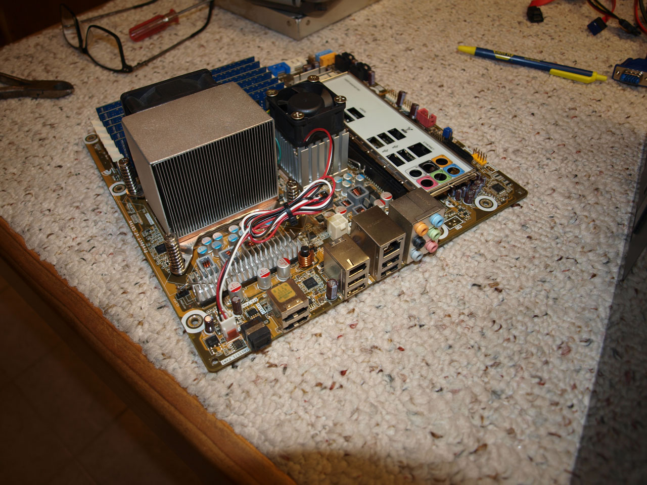 I have an Asus P5KPL-AM SE that I have no clue where it came from, I'm sure it was a dropoff in a scrap case, but I kept the board. It has a Pentium-D @ 3GHz w/ 4mb L2, 2gb RAM, and a GeForce 7300GT 256mb GPU. Now that will go nice in this case! I know, not the greatest GPU, but for this, it's perfect!