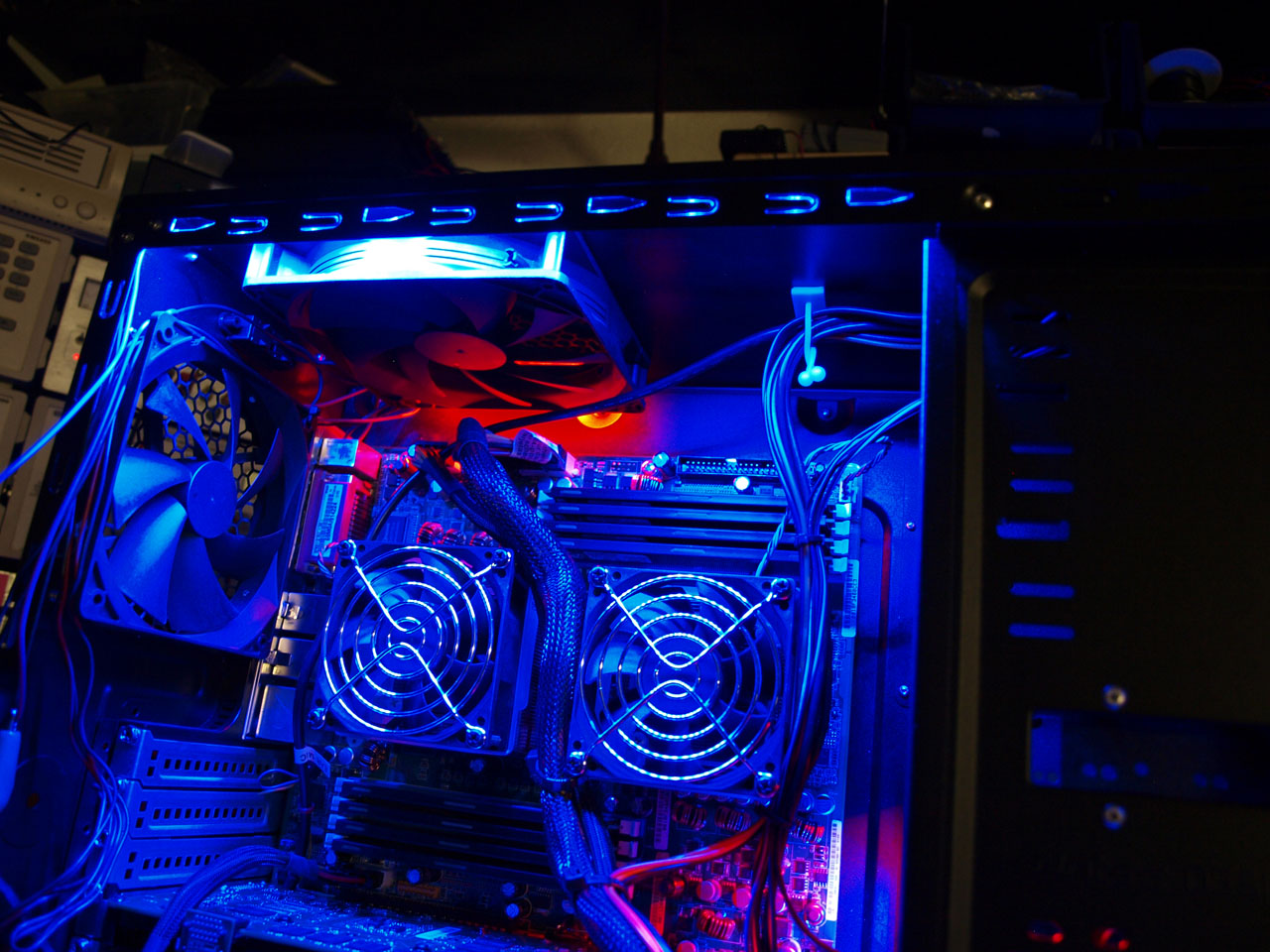 Well this was critiqued today by none other than my 24yr old daughter who said it looked awesome, but the blue was a bit overbearing. Add a little more red if you can....so I pondered....and pondered....and didn't come up with much until I inadvertently realized there was a plastic air guide on top of the CPU heatsinks that basically allowed a 70mm fan to be used on a sink intended for 60mm.... THis raised the fan off the sink a good 30mm; leaving plenty of room between the fan & sink.....and BAM!! The light bulb...err, LED lit up!