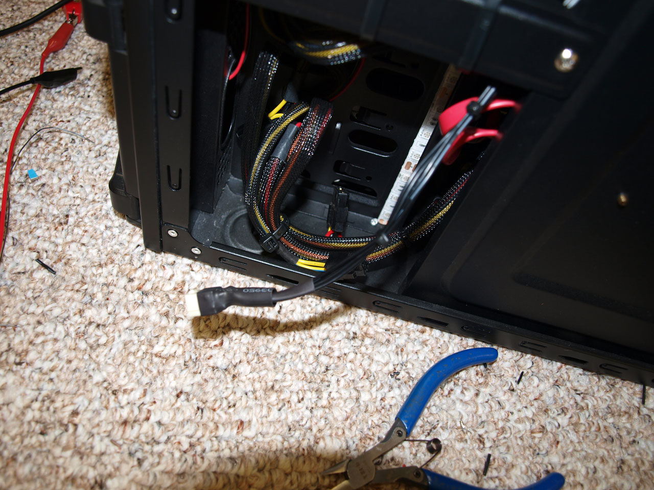 Now to wire them into power....and the reason I used such long wires... I routed these down to the lower right corner where the unused 4-pin +12v connector was tied out of the way (the board uses the larger 8-pin). I then stole the 4-pin connector off a junk motehrboard.