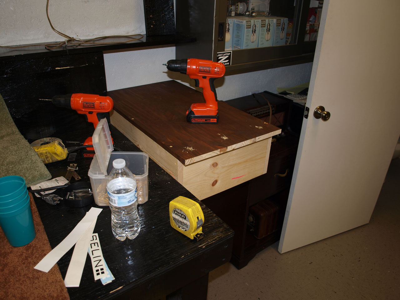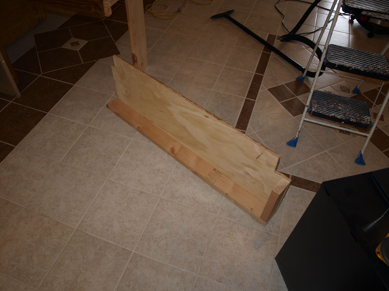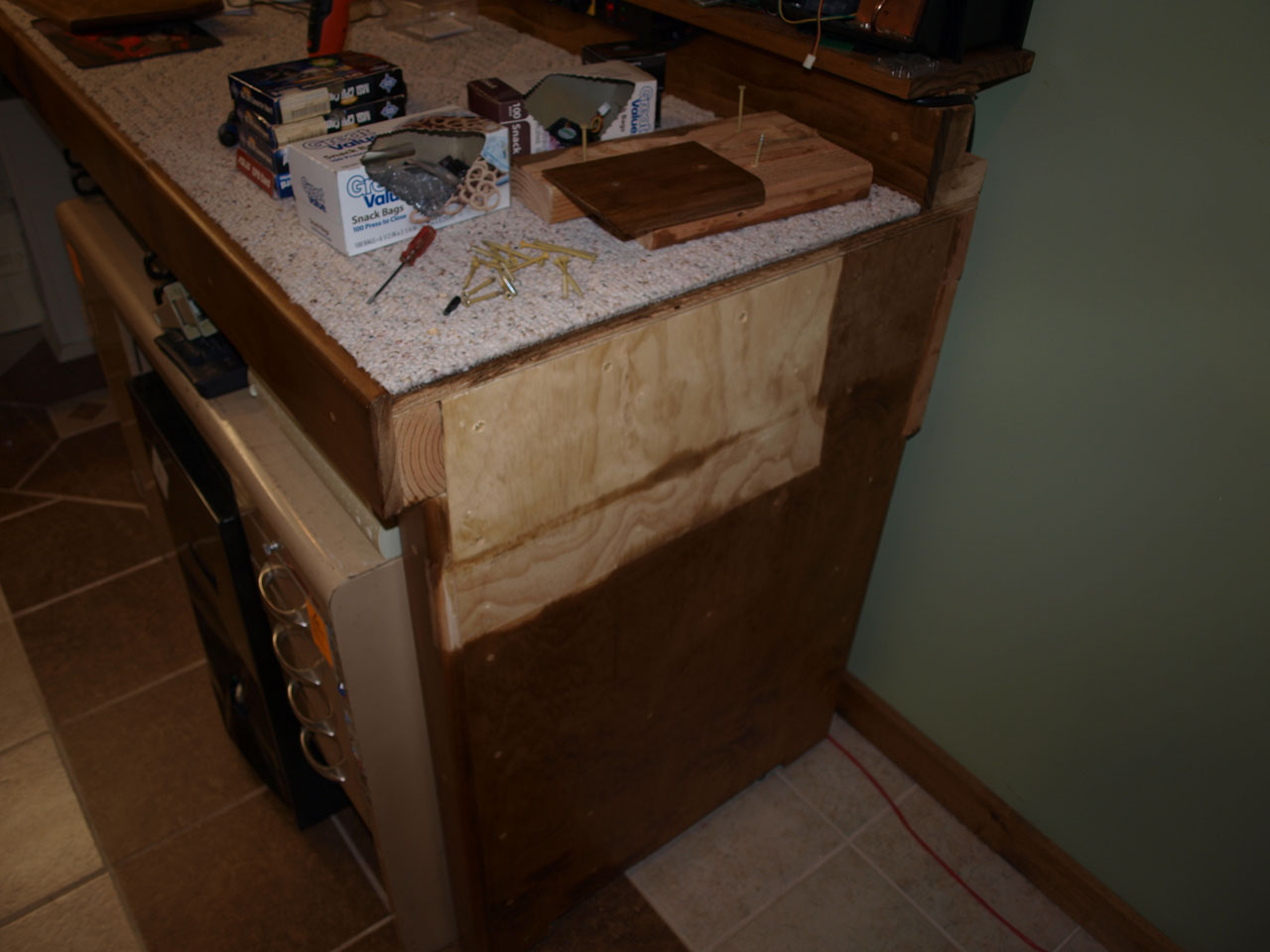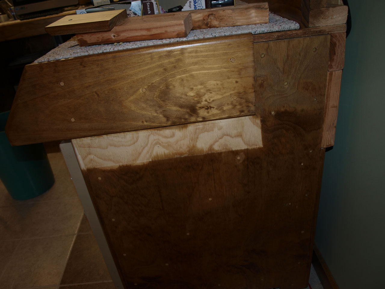 Now test fitting the shelf surface. This stained board was something my wife was using for crafts that she mis-measured and was too narrow for her project....... We don't waste around this place!!