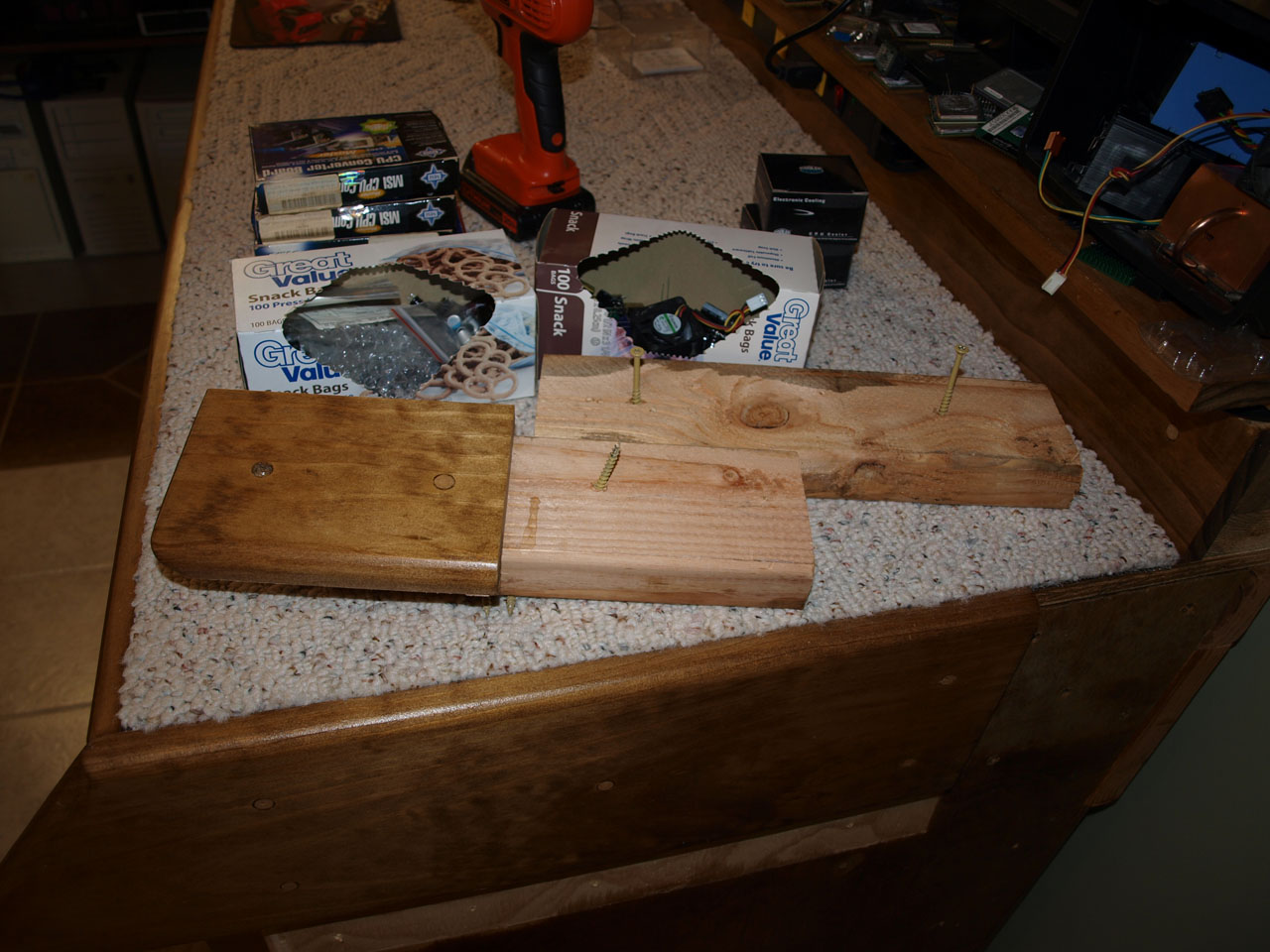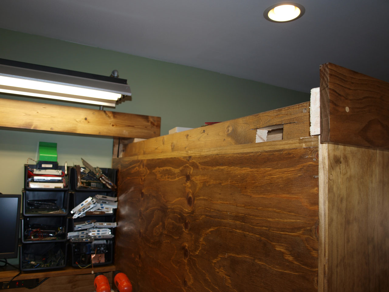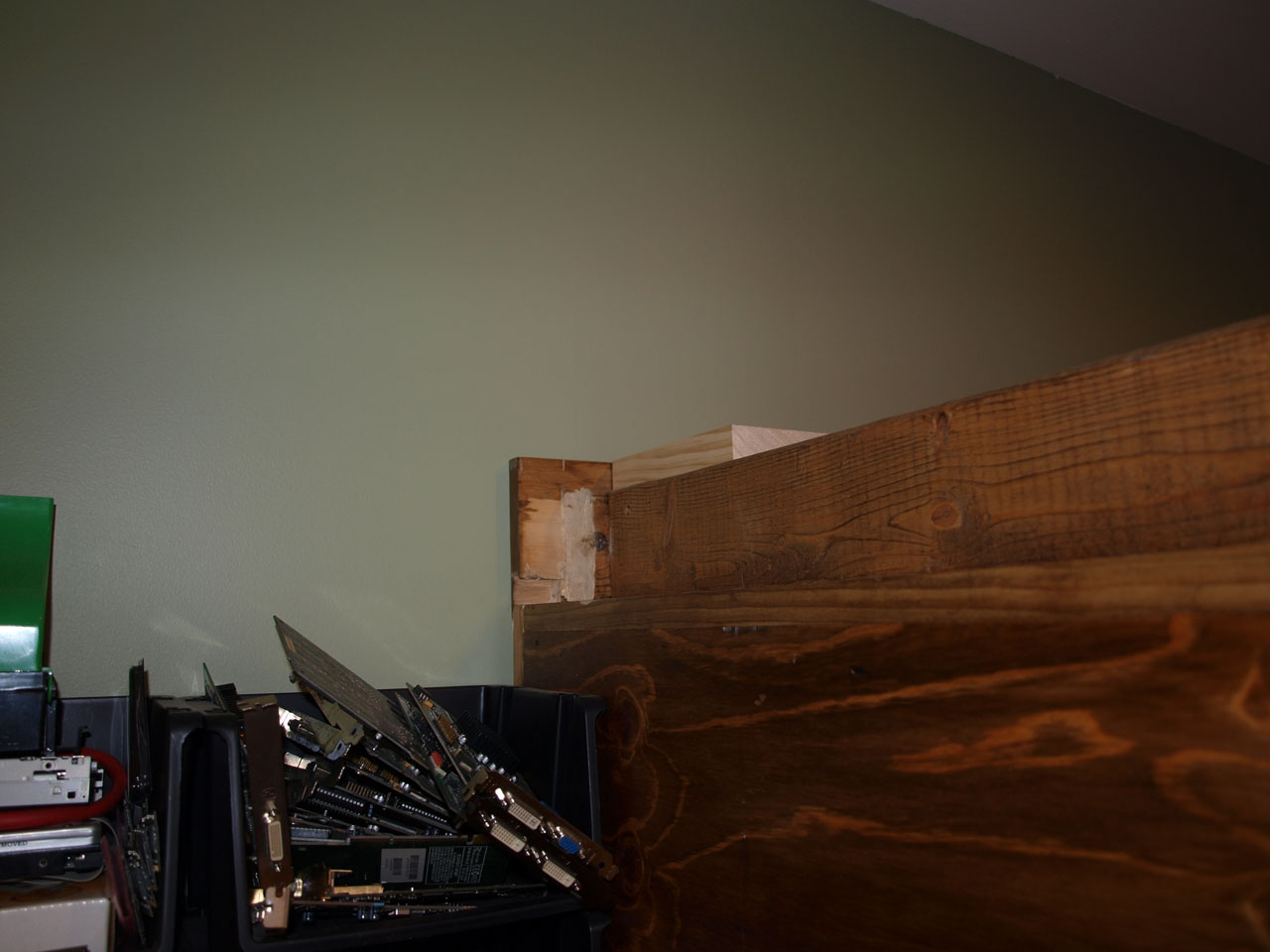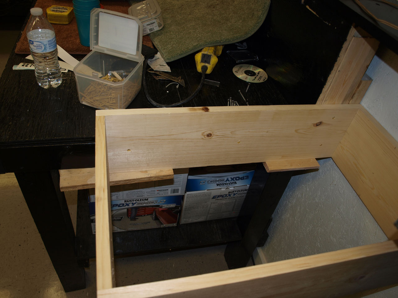 Now test fitting the shelf surface. This stained board was something my wife was using for crafts that she mis-measured and was too narrow for her project....... We don't waste around this place!!
