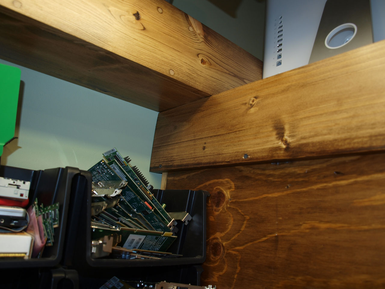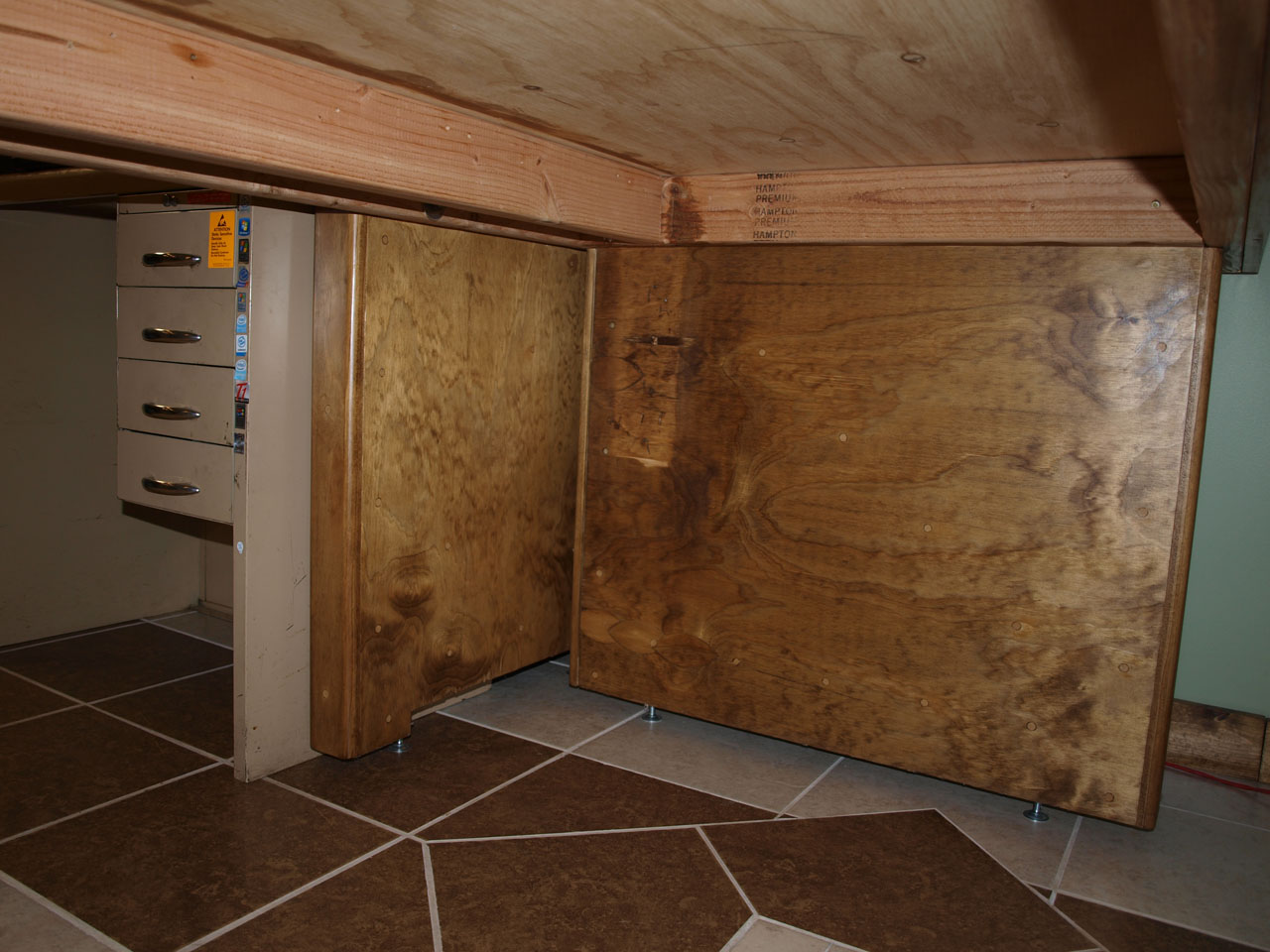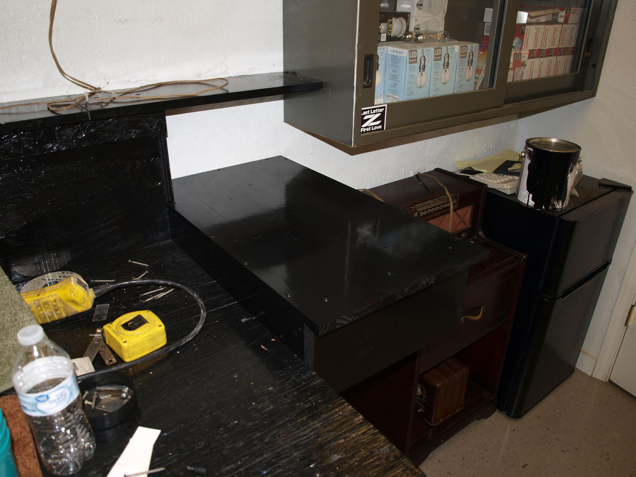 The old plastic storage drawers removed, as well as the backboard end cap.