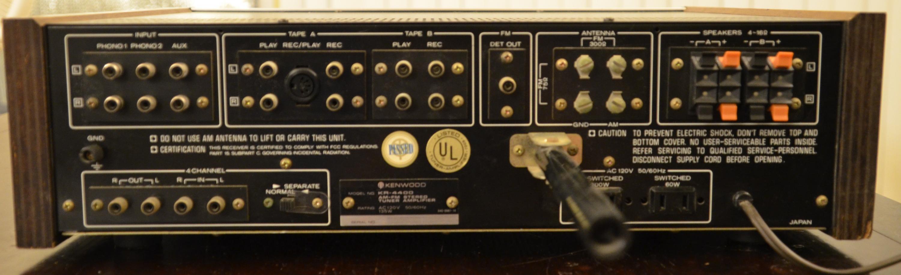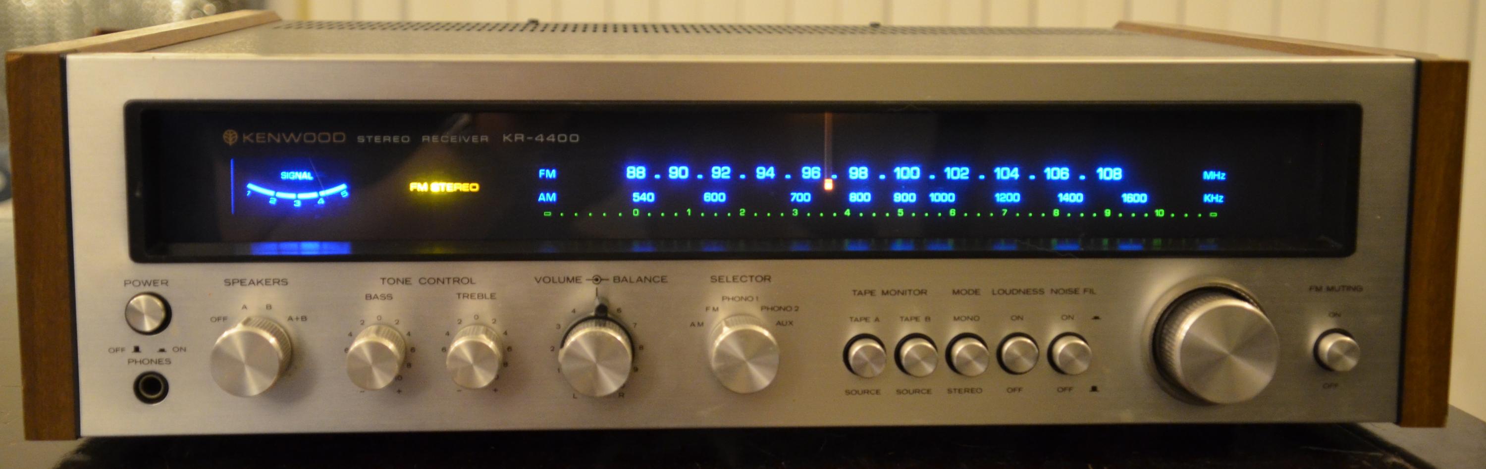 And A Kenwood KR-4400 27 Wpc Stereo Receiver (circa 1974) for $20. I didn't really "need" it, but my dad had one when I was a kid (which was unfortunately lost in a move many years ago) so I always wanted to get my hands on another one and couldn't pass it up for that price. It needed a set of dial lamps (which Kenwood annoyingly soldered in instead of using sockets but I replaced them with LEDs so it shouldn't need to be done again for a long time) and has a couple chips on the wood veneer ends but otherwise is in great condition for a 45 year old receiver.