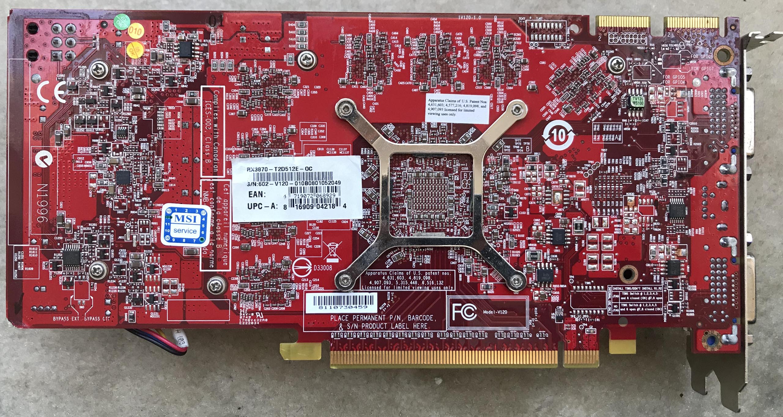 I could return it, but didn't want to due to the looks I wanted. And that was the cheapest MSI HD3870 I could find for a long time (most sellers are still asking $40 to 50+.) So instead I repaired/re-poppulated the missing SMDs (2x 1-KOhm resistors, a VGA output filter bead, and a ripped trace) and got the card working.
