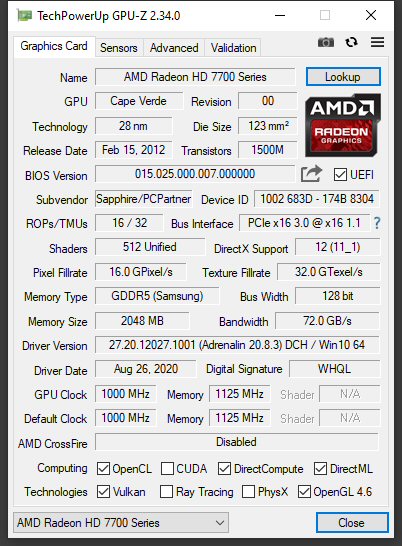 BUT.... your card has a PCI-E power connector and has the same core and memory clocks of the HD8760 and HD7770, rather than the slower clock of the HD7750. So it's not quite a proper HD8760/7770 GHz edition, yet not quite the slower HD7750 either.