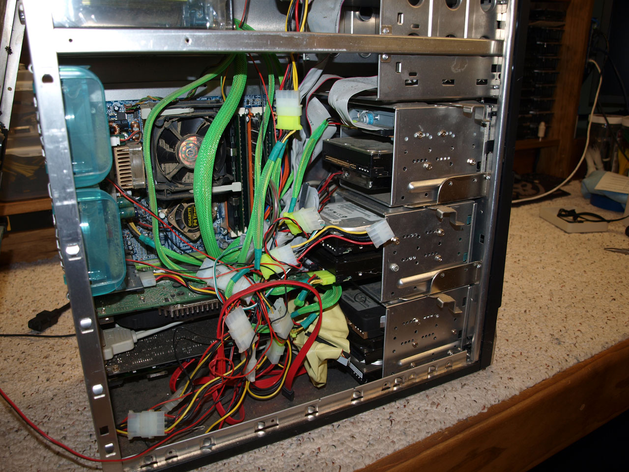Now, lets get inside it!! I counted 6 hard drives....no clue as to their sizes. Whoever assembled this would be fired if they worked for me....total rats nest and no attempt to manage cabling....