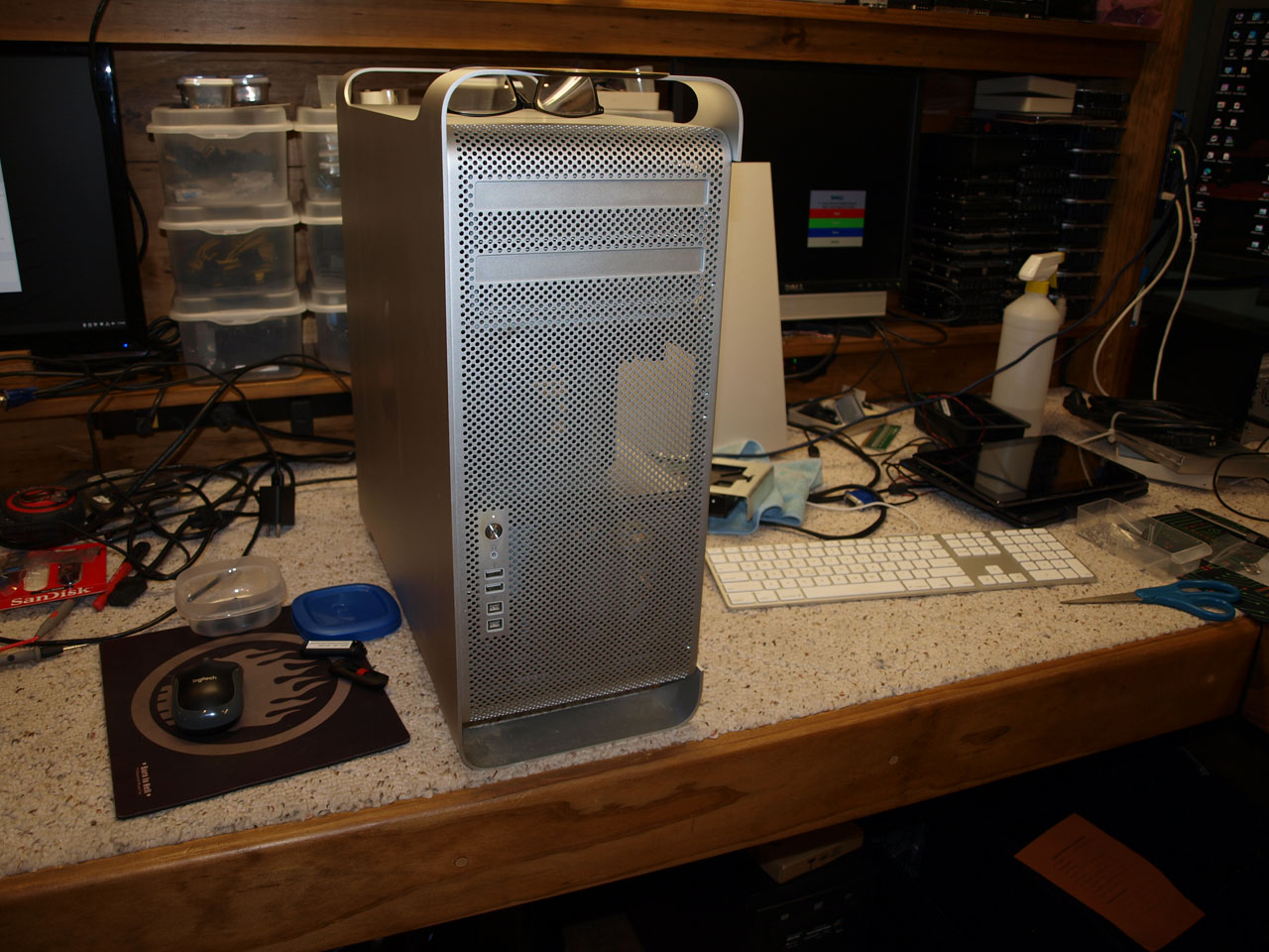 Another G5 and some older core2 era desktops... The G5 has dual CPU's and some kind of liquid cooling setup and 16gb RAM. I've read of the liquid-cooled G5's, but never seen one; no it's not leaking. CPU's are 2x dual-cores @ 2.5GHz. GPU is a Geforce 6600 256mb. Has OSX 10.5.8 on it already and I got lucky; I put in 'password' at the prompt.....and that was it.... Yea, that has paid off more than a few times! Functions well even as useless as it is.