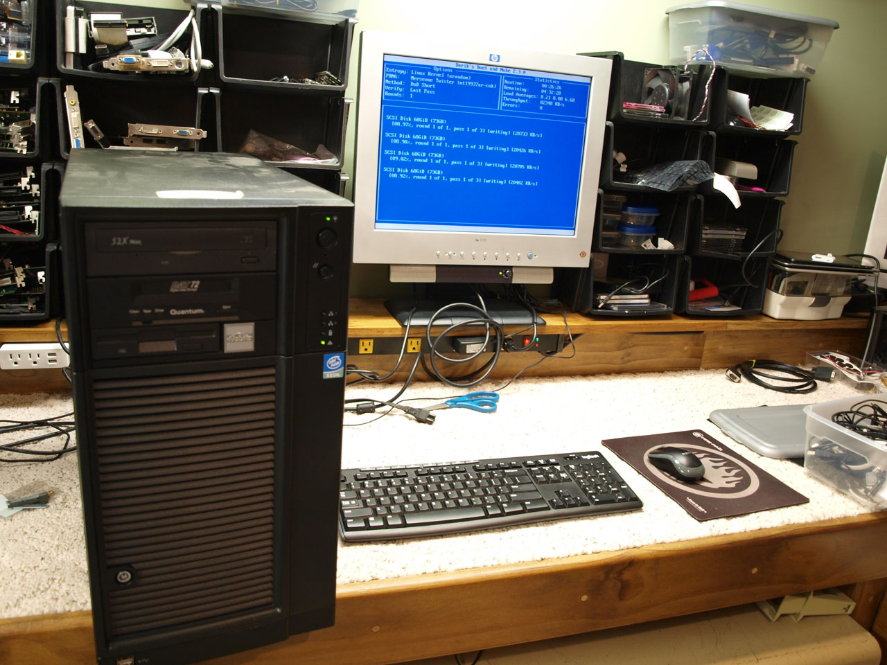 Tested that Intel server, works. It's a SKT604 Xeon @ 3GHz. Dual sockets, but only one is populated. 2gb DDR2 RAM. I was more interested in the case; eATX in a shorter but widebody case. Very classy looker and in mint shape. Has a SCSI SCA backplane and 4x 73gb 10K's in a 147gb RAID10. As if by some miracle, I found a box with a SATA/SAS backplane. As promised, I broke the RAID and wiped the drives.