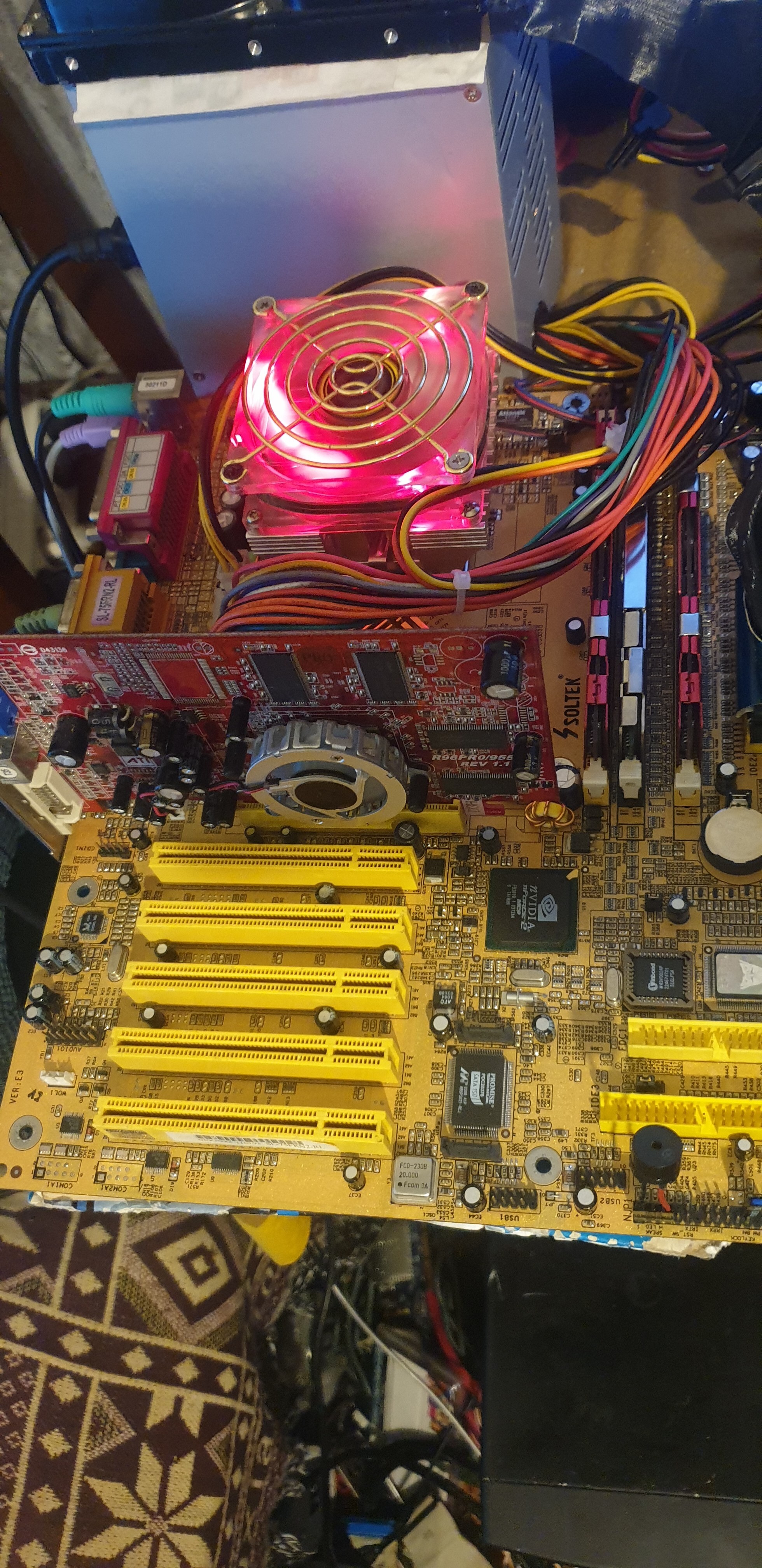 This is the above-mentioned Soltek SL-75FRN2-RL "Golden Flame" mobo, which came from a fellow Romanian retro collector.