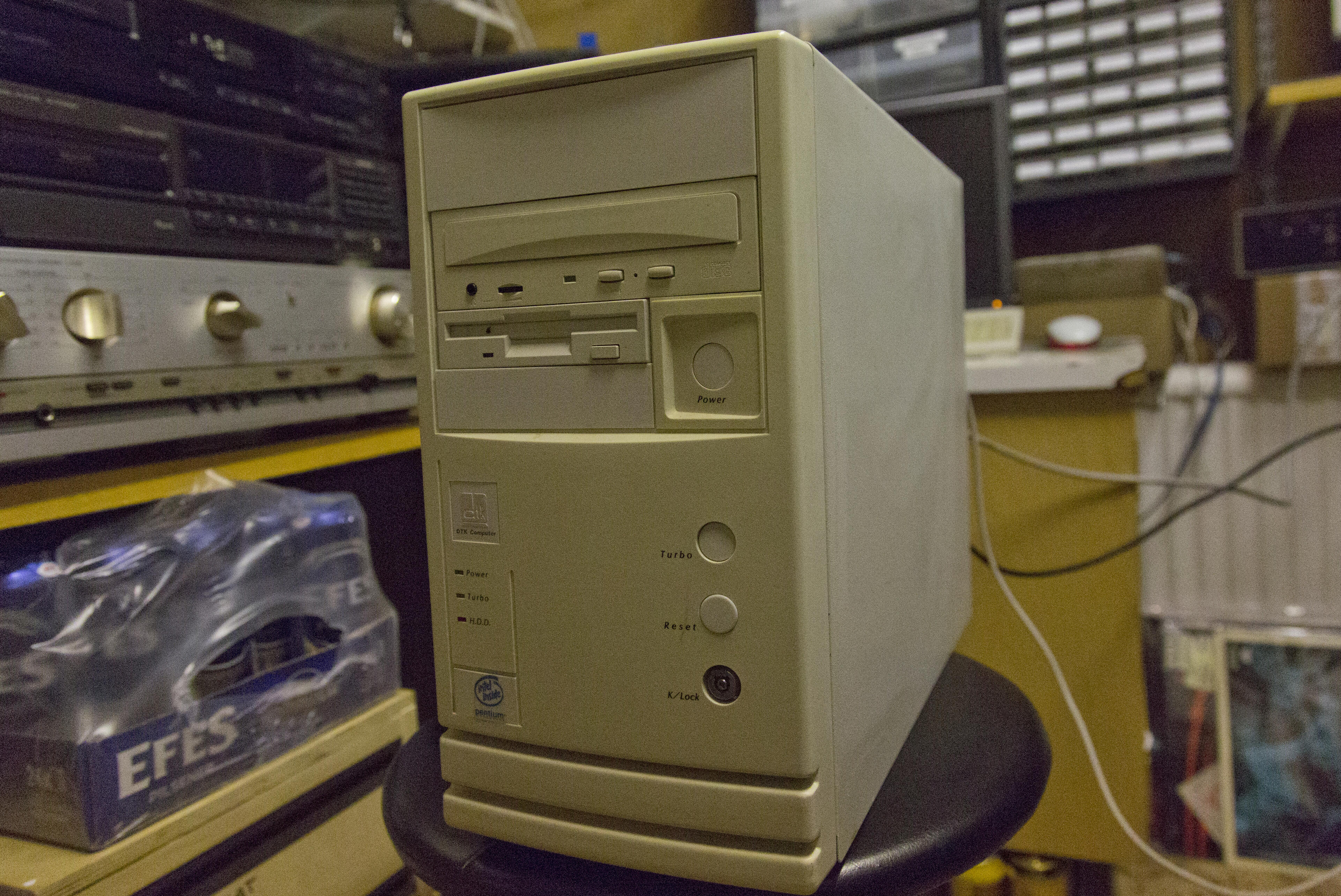 Saved from the dump. 29 years and one day old, as said in the sticker, it says 11-12-1995. The HD is gone, but otherwise working AT-computer with 166MHz Pentium..