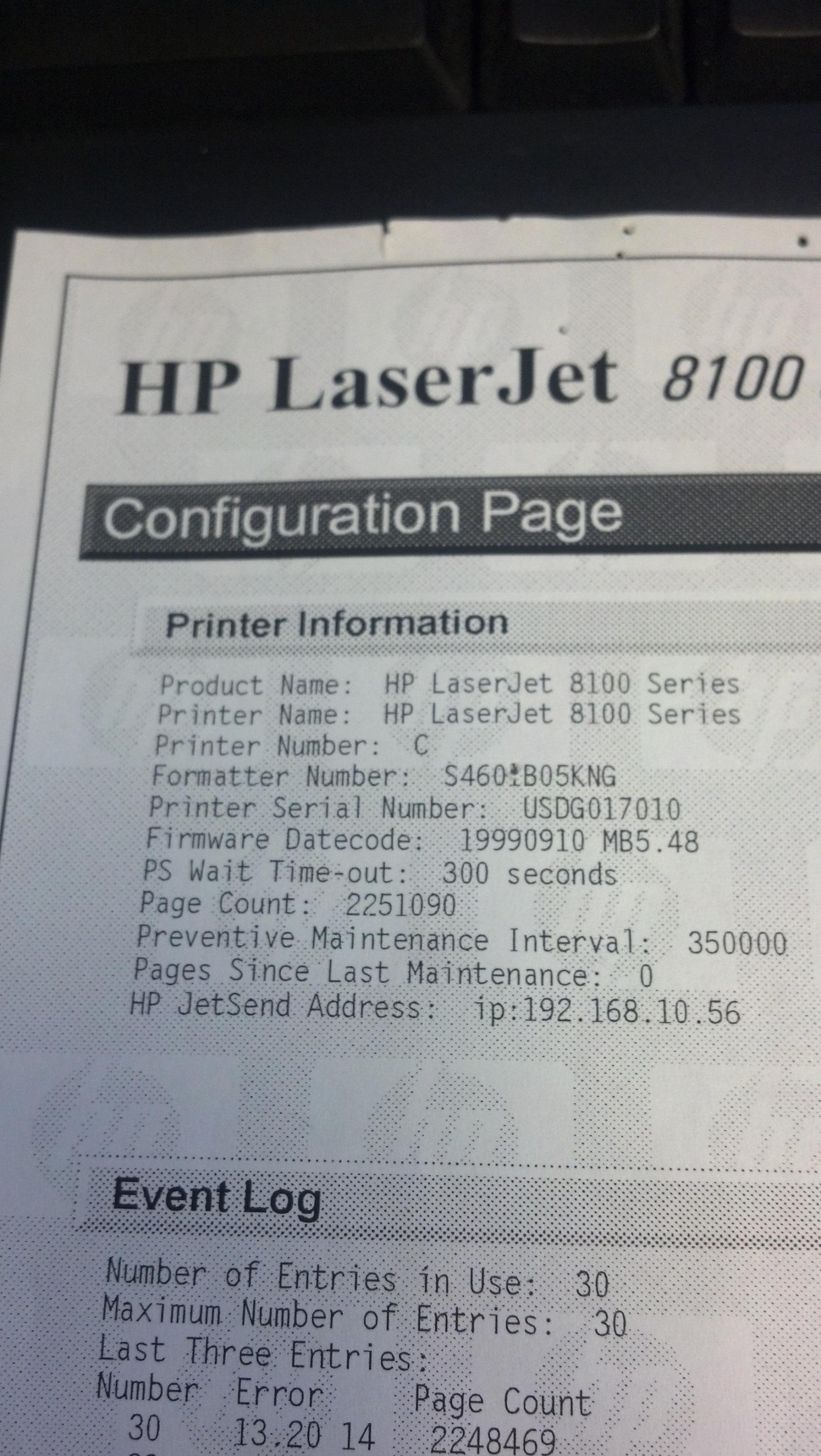 A LaserJet 4250 came in for recycle at work. I set it up in my area...