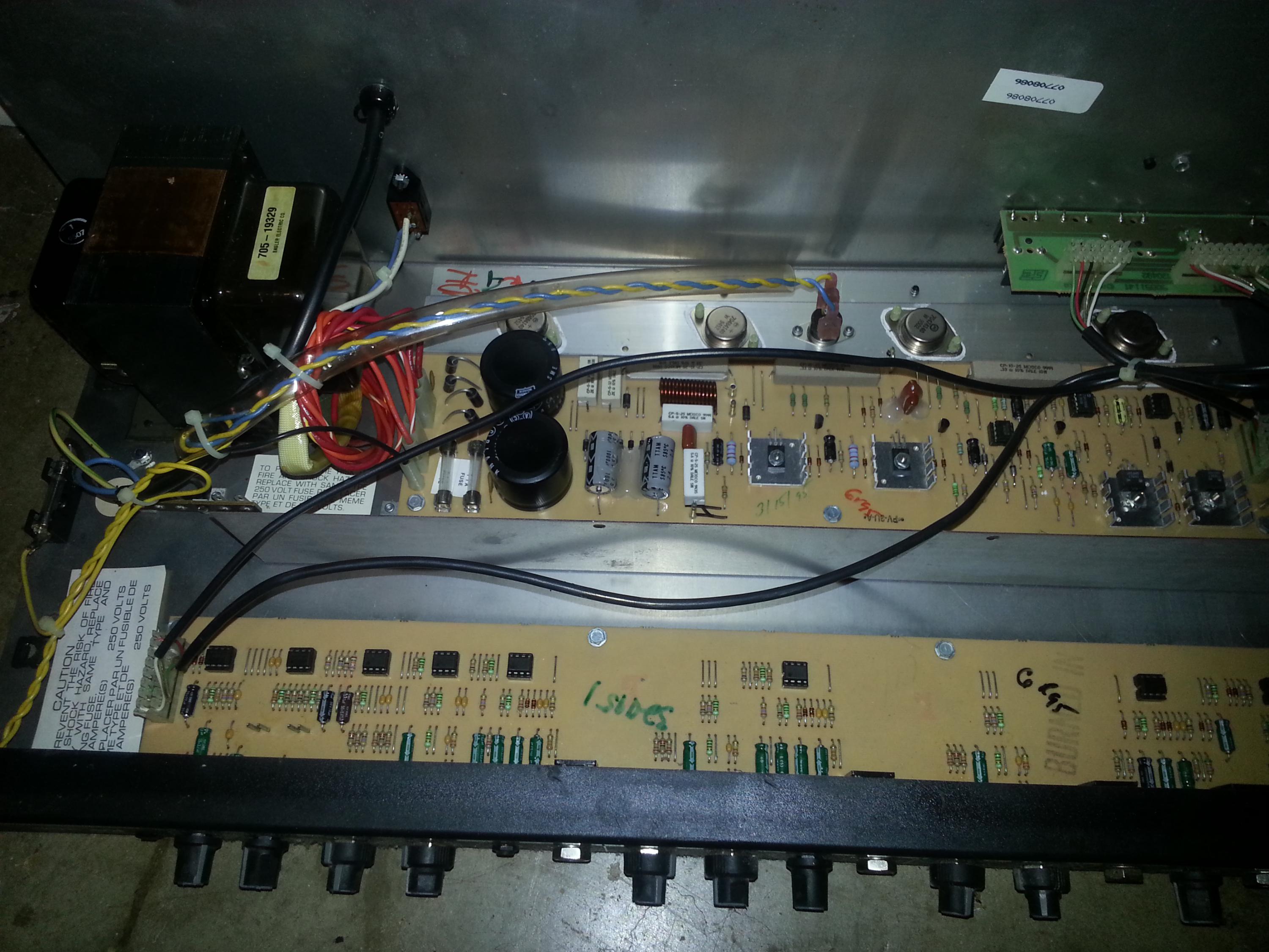 The amp, 500 watts. Dirty as hell, some peeling plastic. Covered in greasy dust.