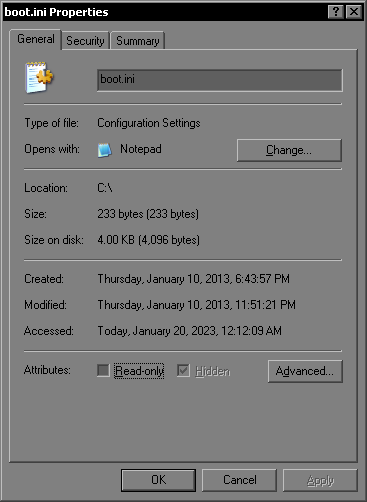I thought its "birthday" is today, January 20... but I was looking at the wrong file. Looking at the boot.ini ...