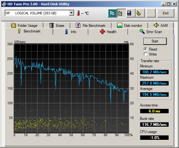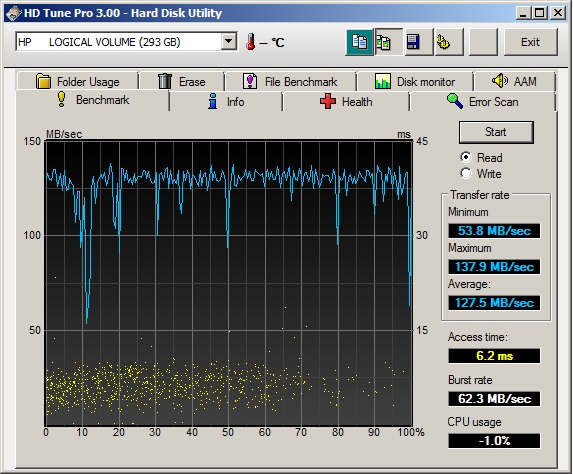SWEET JEEBUS! Guess I just found the reason for no rotational loss in the last one... the controller wasn't keeping up with the drives, even at their slowest! So, we have incredible throughput, obvious rotational loss, but an incredible average! Burst rate is still not the same as the RAID5, which confuses me.