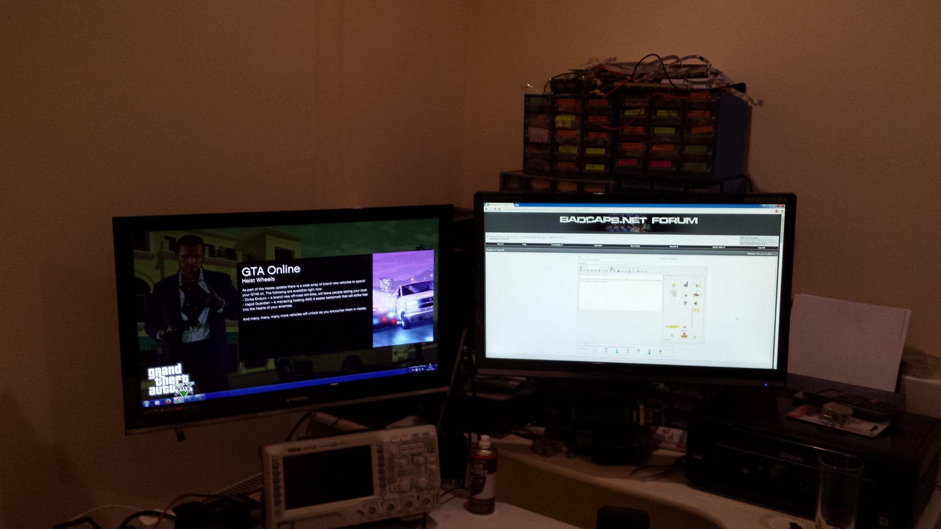 New setup now I've moved into a bigger room... Going to try and find matching monitors to replace my current 24" ones. Maybe 1200/1440p or 4K monitors. Both of these monitors (well, one is a TV) were trashpicked, but I don't mind spending a few £s on new ones if they are good quality.