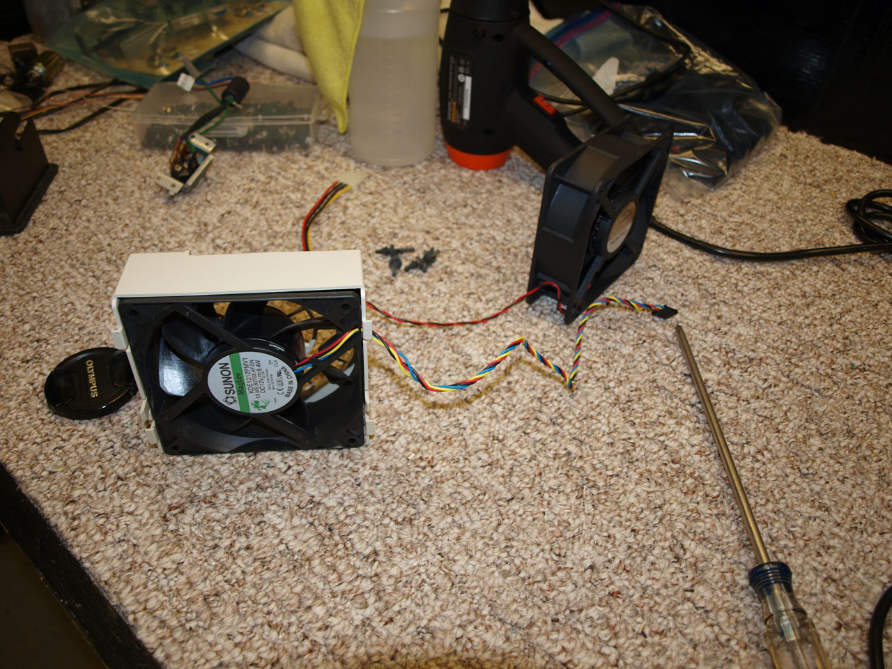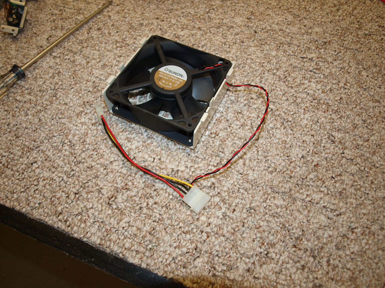 First thing was to replace this 120mm fan with a PWM one. This one was a pure 12v, and very loud. 5V wouldn't even start it....