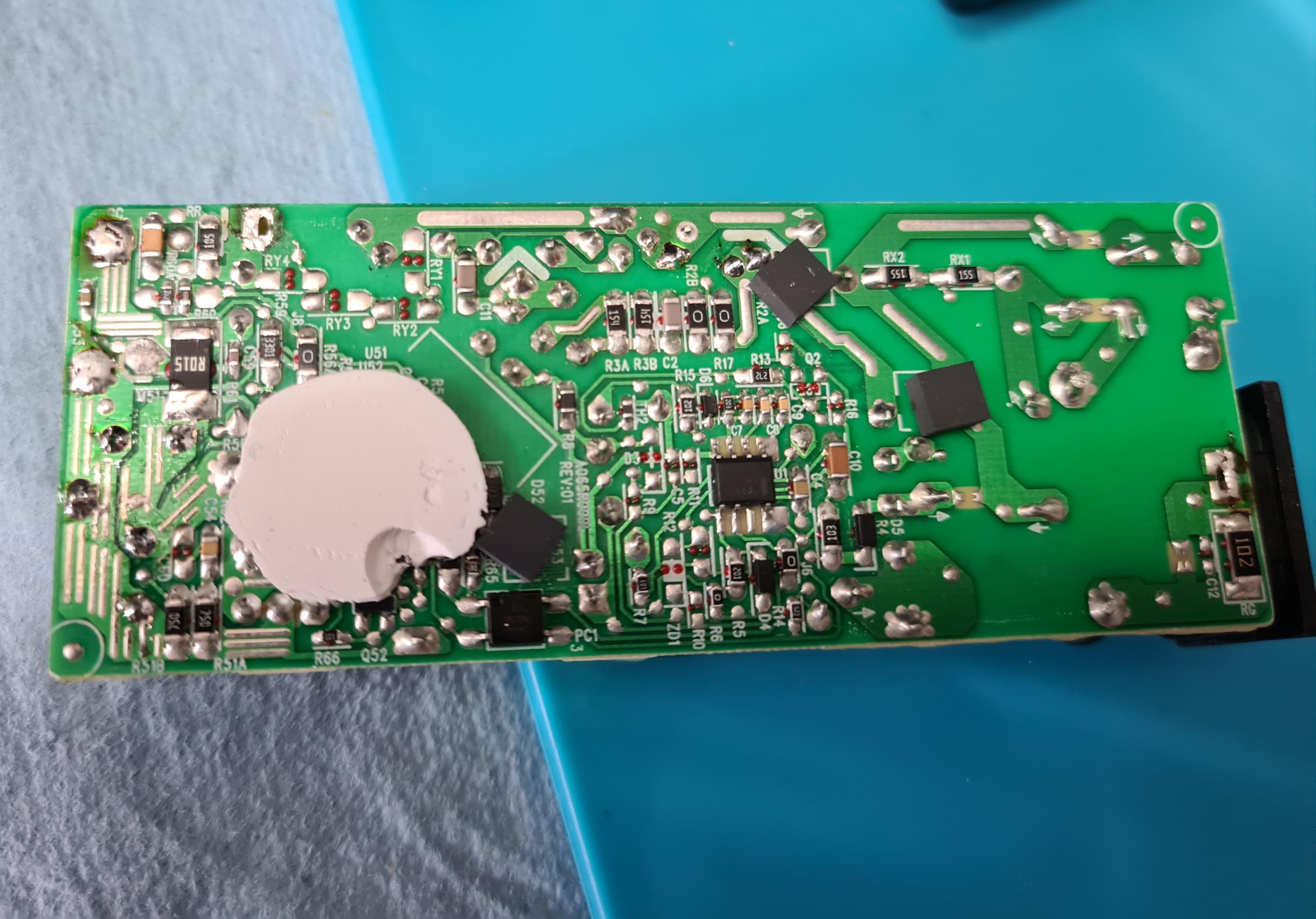 Another thing to try is to solder a bridge across the R015 SMD resistor on the solder side. This resistor is responsible for detecting output over-current condition. If it has drifted out of spec (pretty much impossible to measure with a regular DMM), that could also be what is causing the adapter to shut down under load.