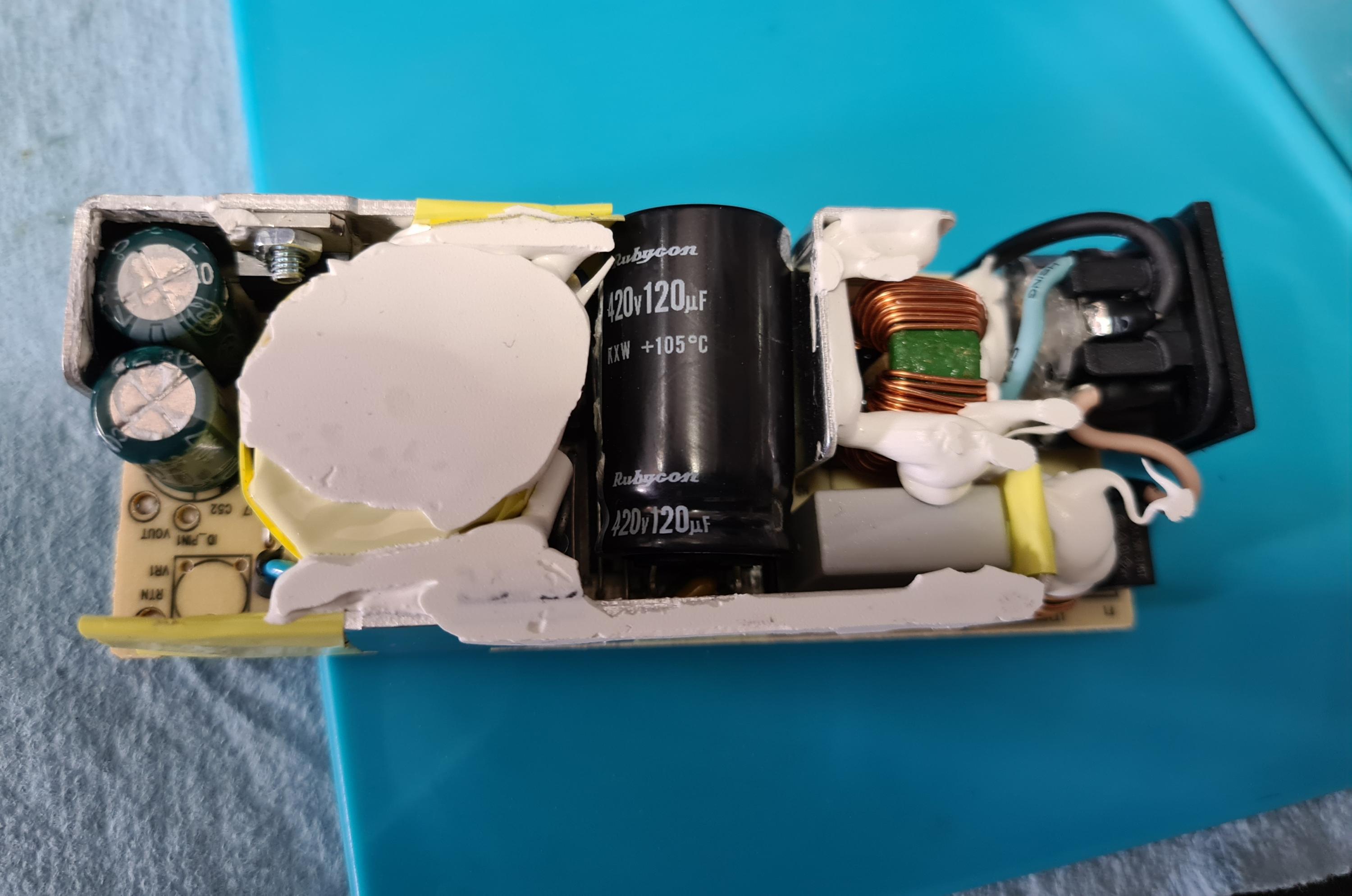 Also, there should be small 5x11 mm electrolytic cap somewhere near that big mains cap, and is typically what is responsible for startup and maintaining operation of the PWM chip on the primary side. So when you do find that cap, take it out and check it out on the ESR meter for proper ESR and capacitance. That could be one of the reasons the adapter is failing under load.