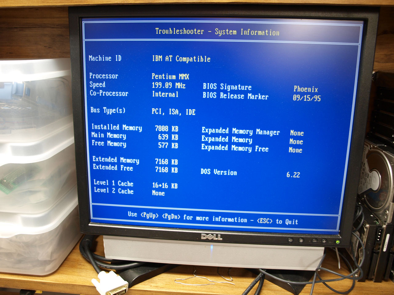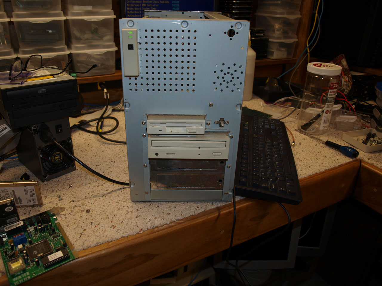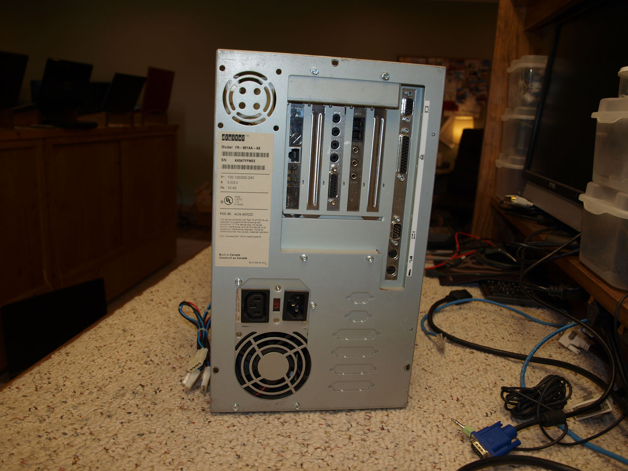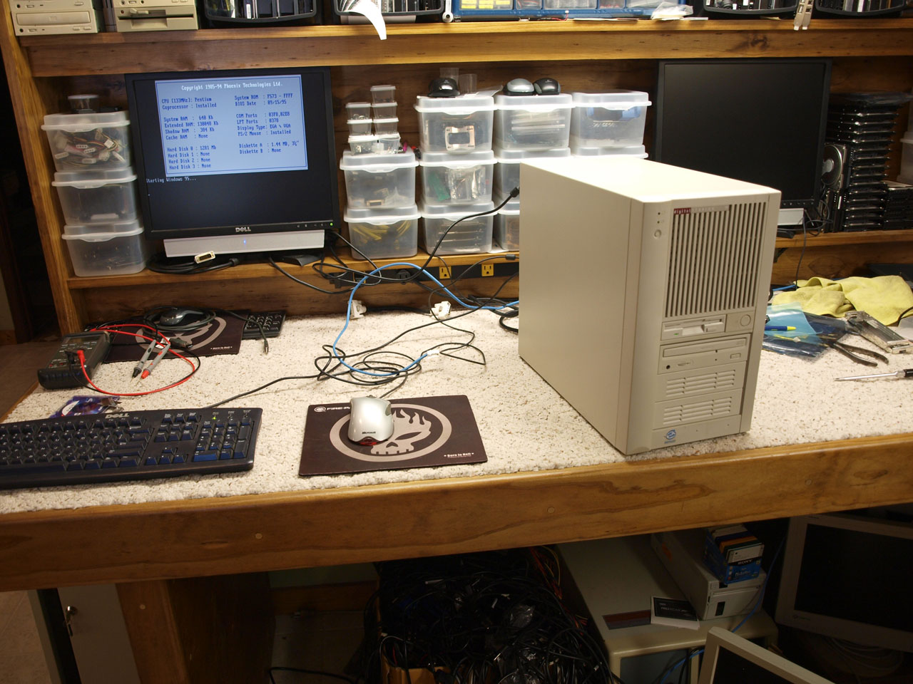 Two issues I found that were booting killers for it; the Dallas RTC is bad (won't hold BIOS settings, but will keep the time/date...go figure) and the 1.2gb Quantum Fireball (furball) is bad (spins up, seems ok....and then out of the blue will spin down). The floppy is flaky (struggling to read; even after cleaning), and the 4x Mitsumi cdrom has not been tested. The system is otherwise functional. It was originally a Pentium classic @ 133MHz (as per the sub-model # of 5133). Someone tossed a 233MMX in it, but its limited to a multiplier of 3x; so only runs @ 200MHz. It had 8mb onboard RAM, I added a couple 64mb modules I had on hand to give it 128mb. It's weird, it shows the onboard 8mb memory, but when you add the modules, the POST count and the testing software only sees the modules.... Not a big deal really, just kind of strange.