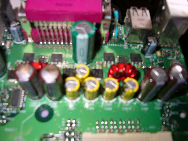 I'm going to use RD's pic as a map and see if I have the same bad caps in mine. My 4550 doesn't seem to have any issues at the moment. Its just has that same kind of ongoing "not fast" issue as the others that I have had. Maybe I'll switch out the hard drive this time just for the hell of it. Right now it has a WD600BB-75CAAO 7200 rpm IDE drive in it. There is also a Seagate Barracuda 40GB 7200 rpm IDE drive in the case but its not hooked up. I also have a WD400BB-OOCJA1 7200 rpm IDE drive here. My wife's Dell PC has a WD800 something or another drive in it. Her PC is slow as shit if you don't use the WD harddrive setup disk on it first when reprograming it. This may be my problem to as I have never used the WD setup disk on mine. With her hard drive when the setup disk is used it puts the data in different areas of the disk than it does if you just do the programing raw without it.