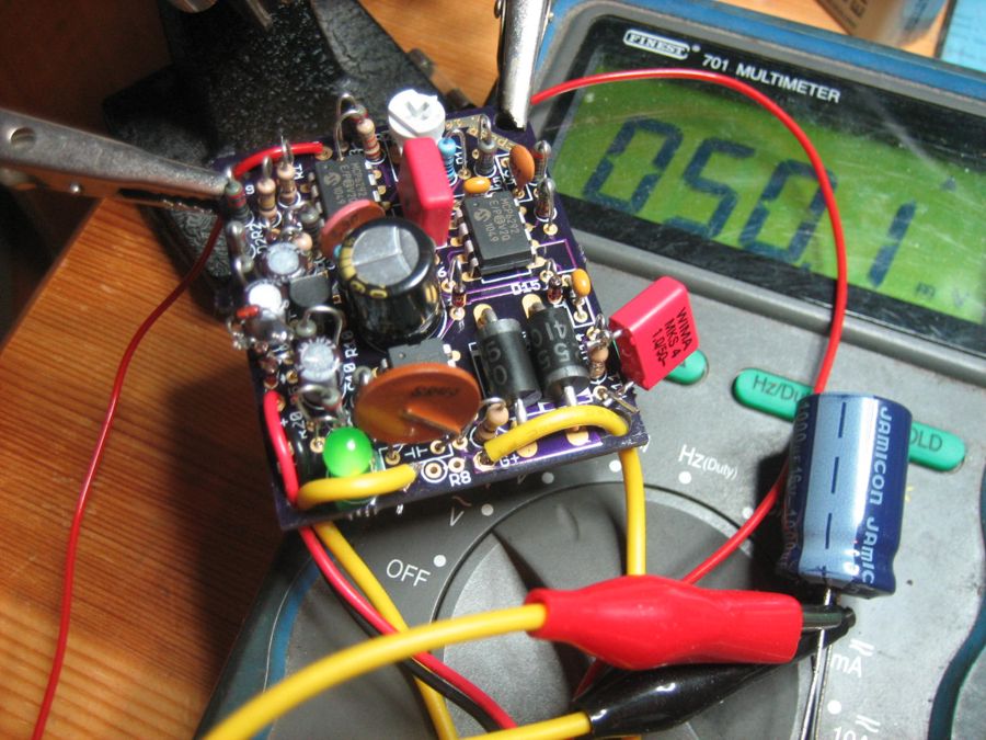 Test leads are connected at pads marked G+/-. This version uses two-lead measurement and runs from 9V battery