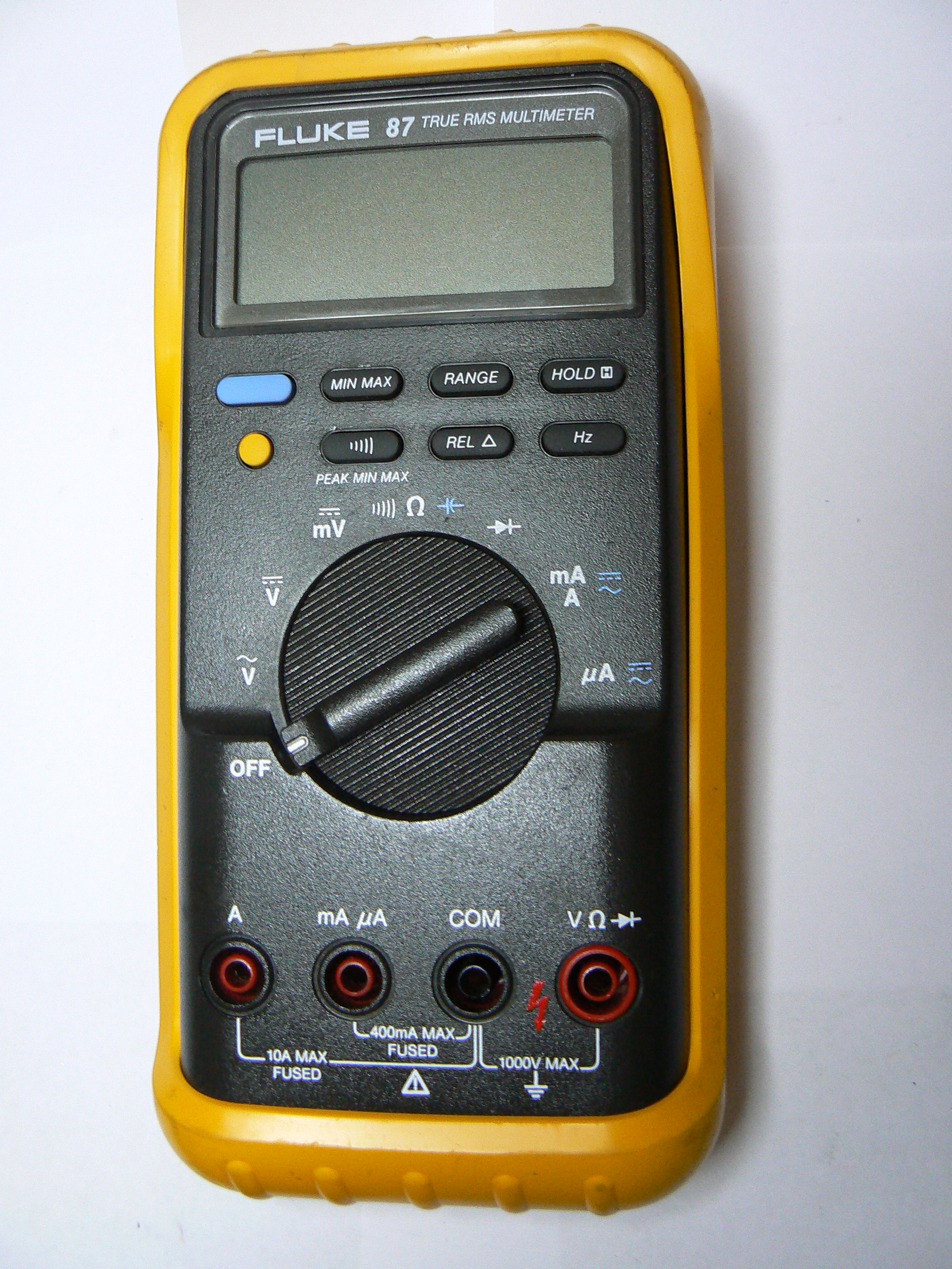 I recently picked up another meter from a local pawn shop, this one is a Fluke 87. When I saw it I was immediately attracted to it because it had lots of features in one meter that I previously only had over several meters. I also liked the display but I later realized that it washes out really bad when viewed from the top. When viewed straight on and below it is bright and crisp. Although I knew there have been several iterations of the 87 model I was not aware of how old this meter really was, it was actually manufactured in the early nineties.