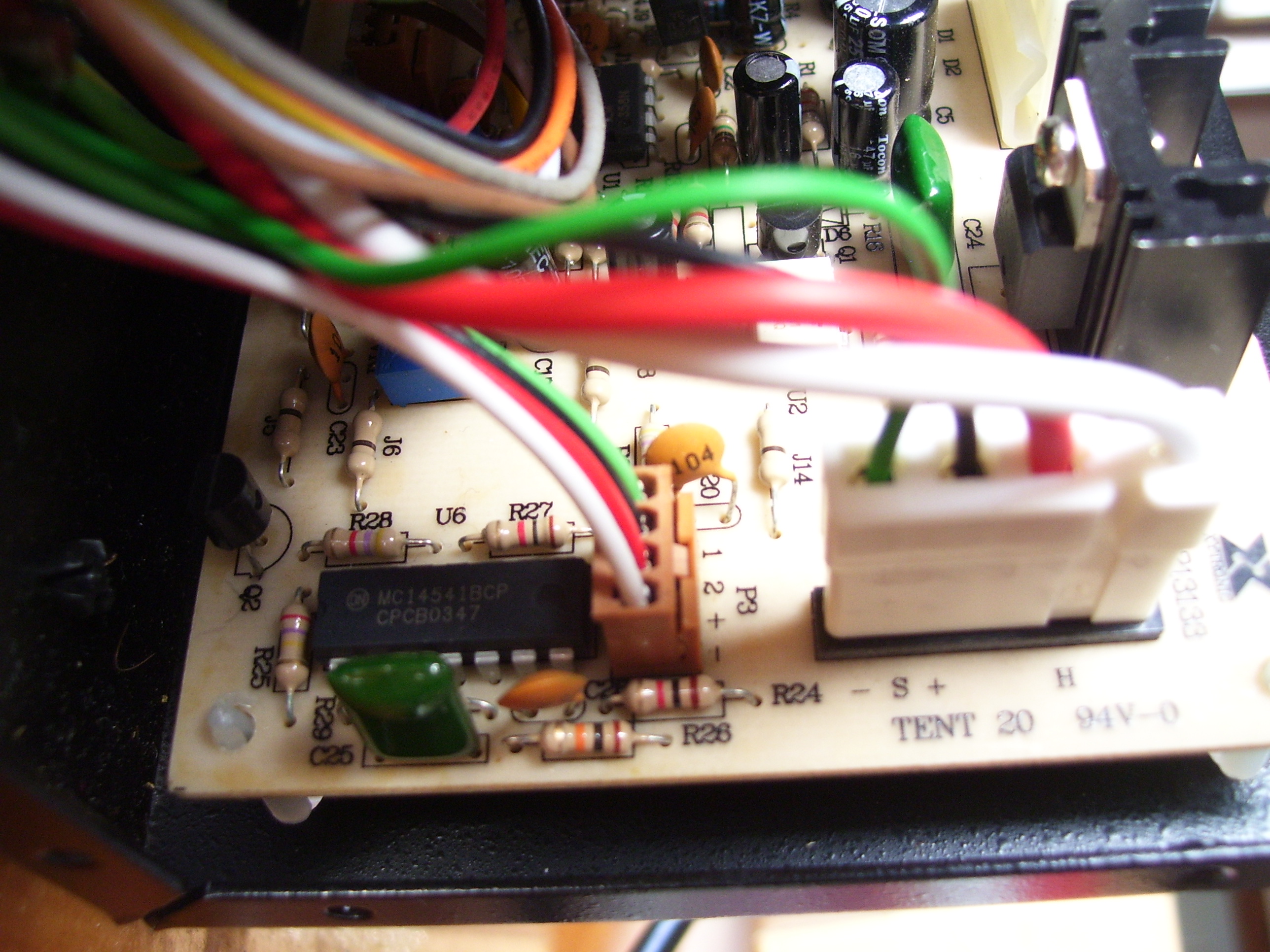 The wires (red and white) from the green LED, plug into the circuit board, along with two other wires that come from the top two pins of the iron socket (black and green)