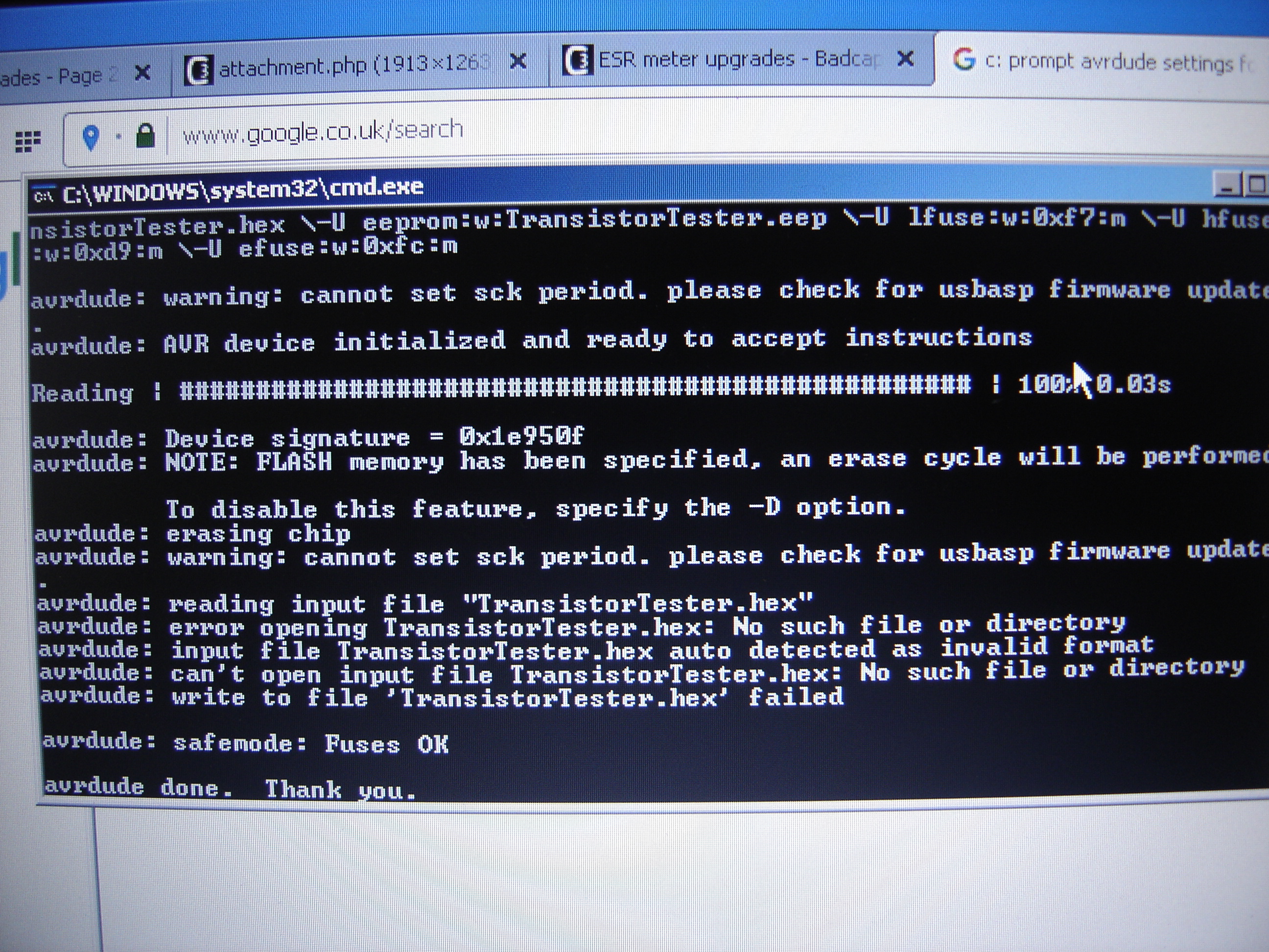 avrdude -c USBasp -P usb -p m328p -U flash:w:TransistorTester.hex \-U eeprom:w:TransistorTester.eep \-U lfuse:w:0xf7:m \-U hfuse:w:0xd9:m \-U efuse:w:0xfc:m) to get the flash for mcu to except, sorry if I sound a bit thick