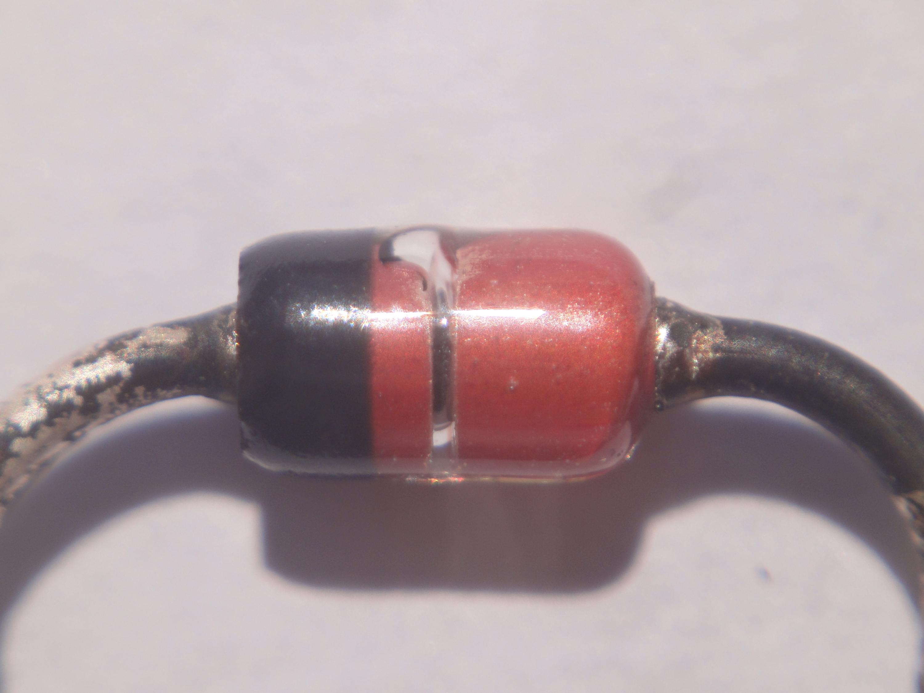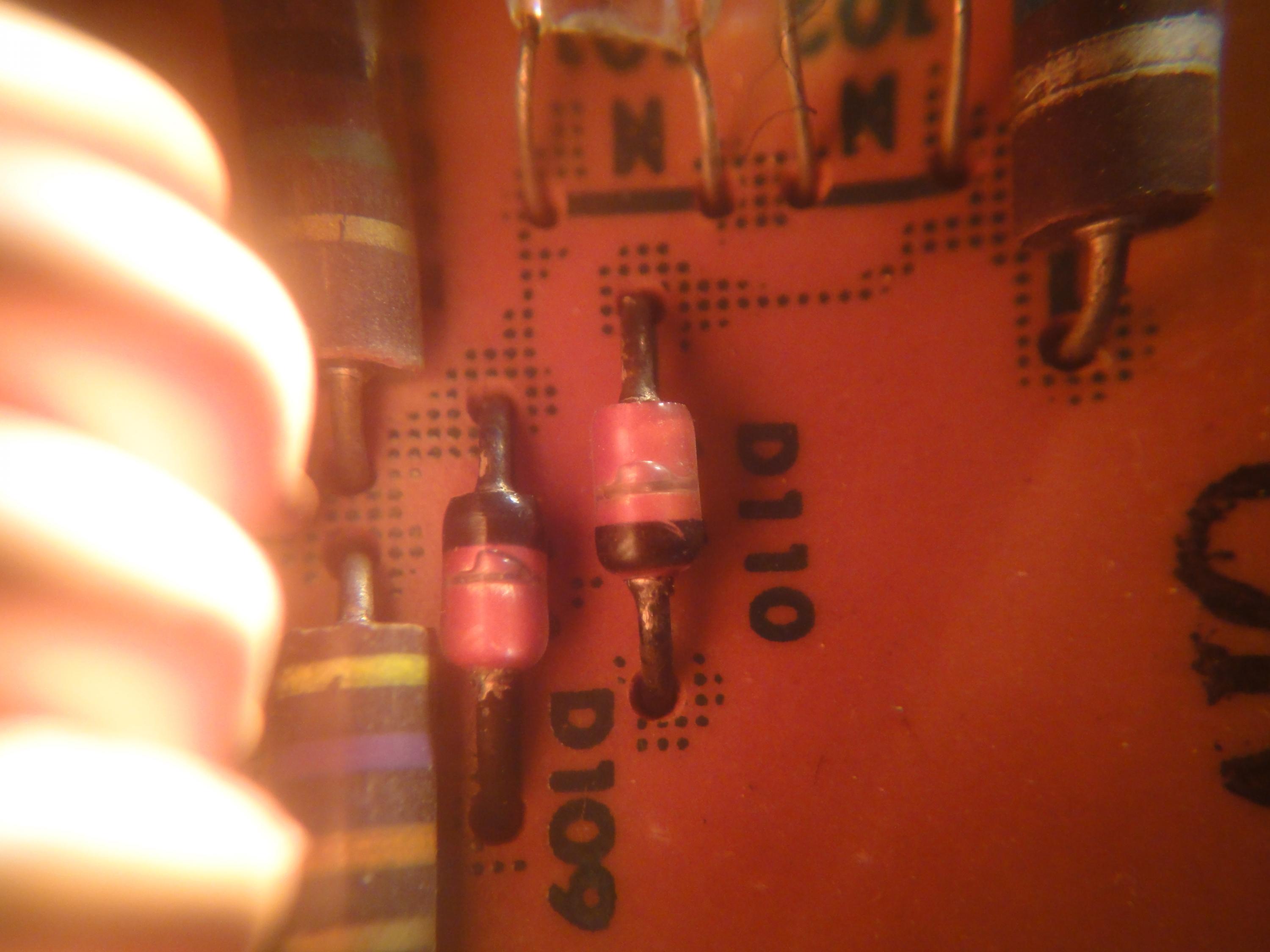 I unscrewed the shield from the HV circuitry and had a look. Nothing seemed untoward at first, but diodes D109\D110 do look a bit funny on top. They tested OK in-circuit though, maybe it's just the red paint(?) has gone over time with heat or something? Any ideas?