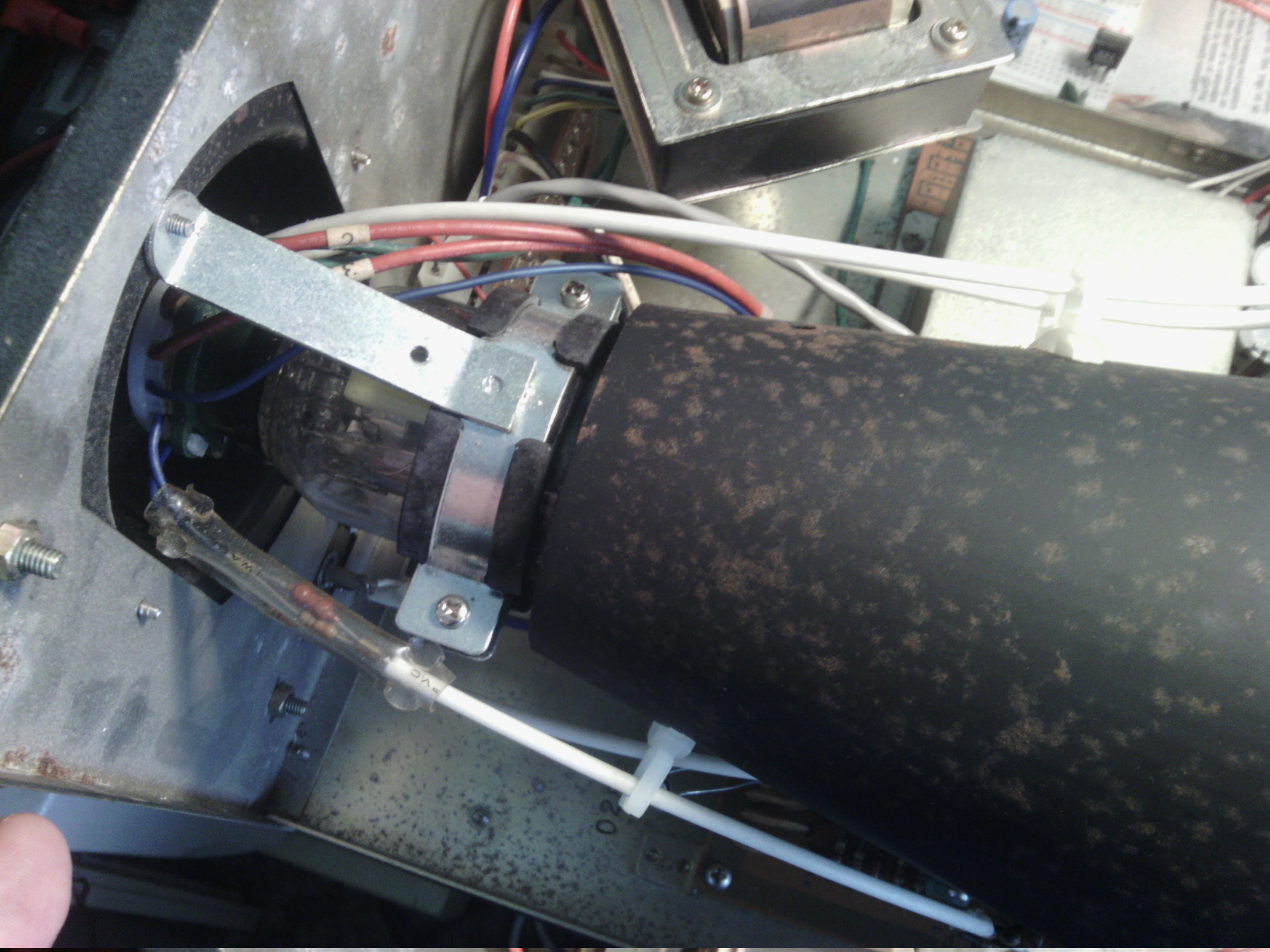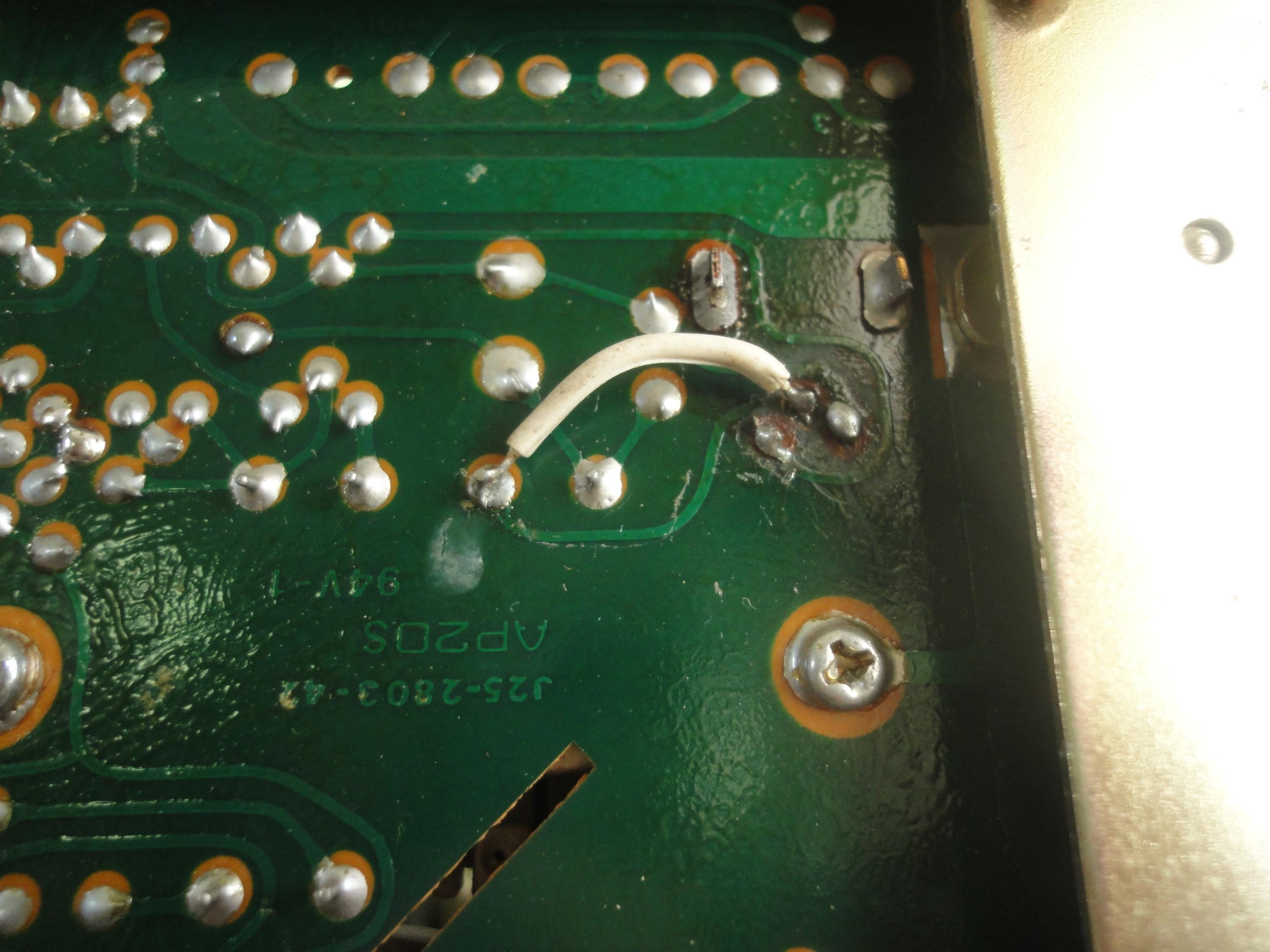 A quick look at the underside showed a lifted and (not too well) repaired trace on Q142. A good clue! Though how someone trashes a big pad on a single layer board is beyond me.