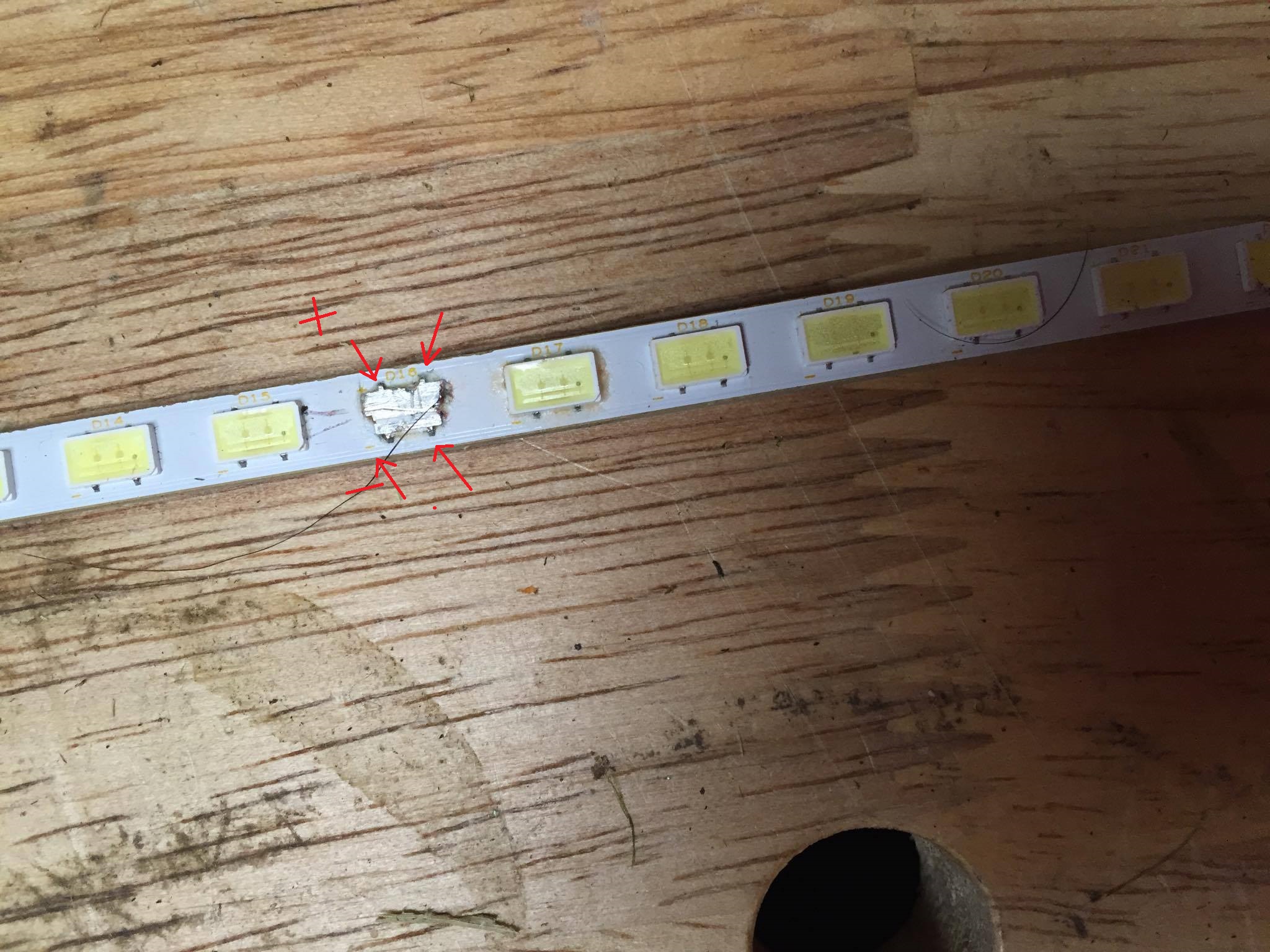 I'm seeking some electrical help to replace a bad LED on the board from my tv. Pictured below is a zoomed in picture of 2 diodes from the LED strip taken from my tv. I've exhausted all online resources to find a simple replacement, so now I'm moving onto the repair stage. I'm a mechanical engineer, and as such, don't know the proper and tricks to working everything electronic. I've had 2 suggestions come to me on this board. Replace the LED diode or simply smash the diode and bridge the +/- connections. So which is easiest and how to I do it? As you can see, the diodes are really, really small. They're also very thin as the board is sandwiched between the mounting plate and the glass panel in the tv. I understand on how to solder PC boards that have thru holes, but have 0 experience with boards like this that have an aluminum backing that prevents access to the bottom of the board. Any help would be appreciated. Thank you.