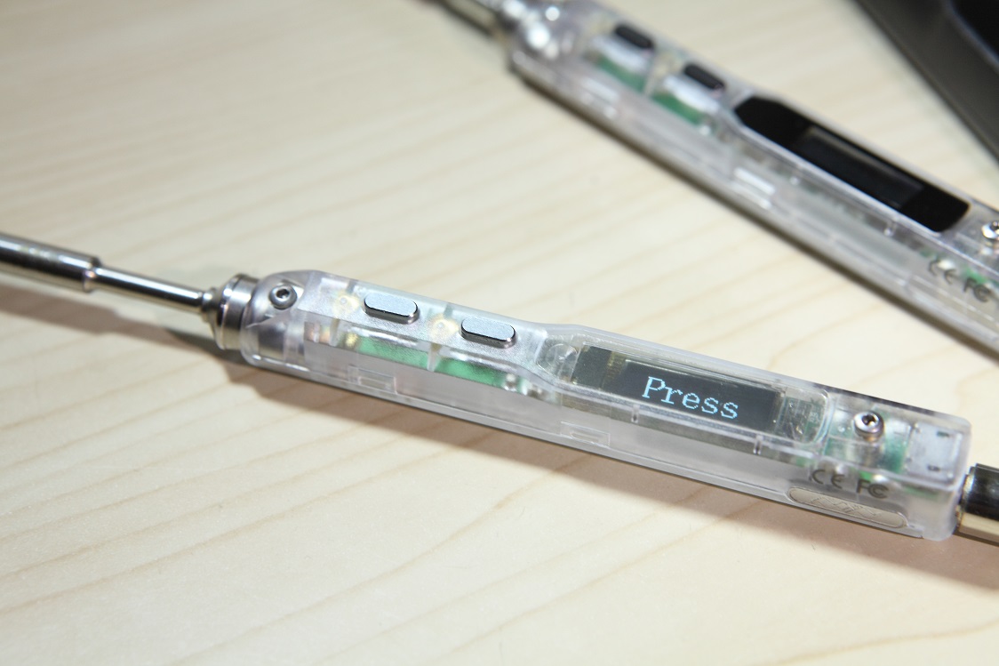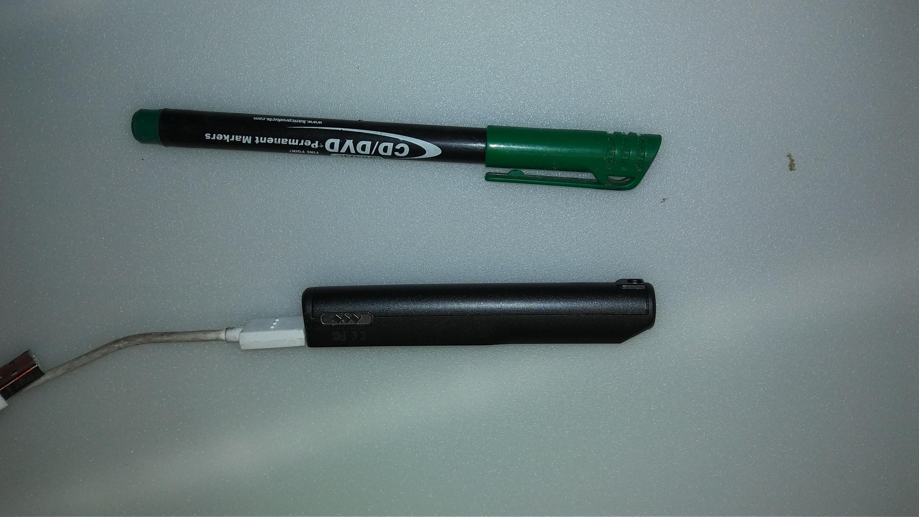 Hold the button closest to the tip, and plug in the USB to the computer.