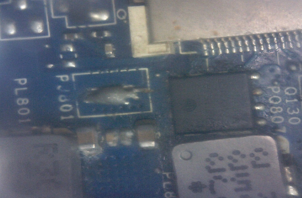 Today, the customer came back. I opened the laptop and observed one side of the capacitors in the area got a dark color. Even the solder of PJ801 became dark. This is what happens to capacitors when they get liquid damaged. but the other pins of the components look shinny.