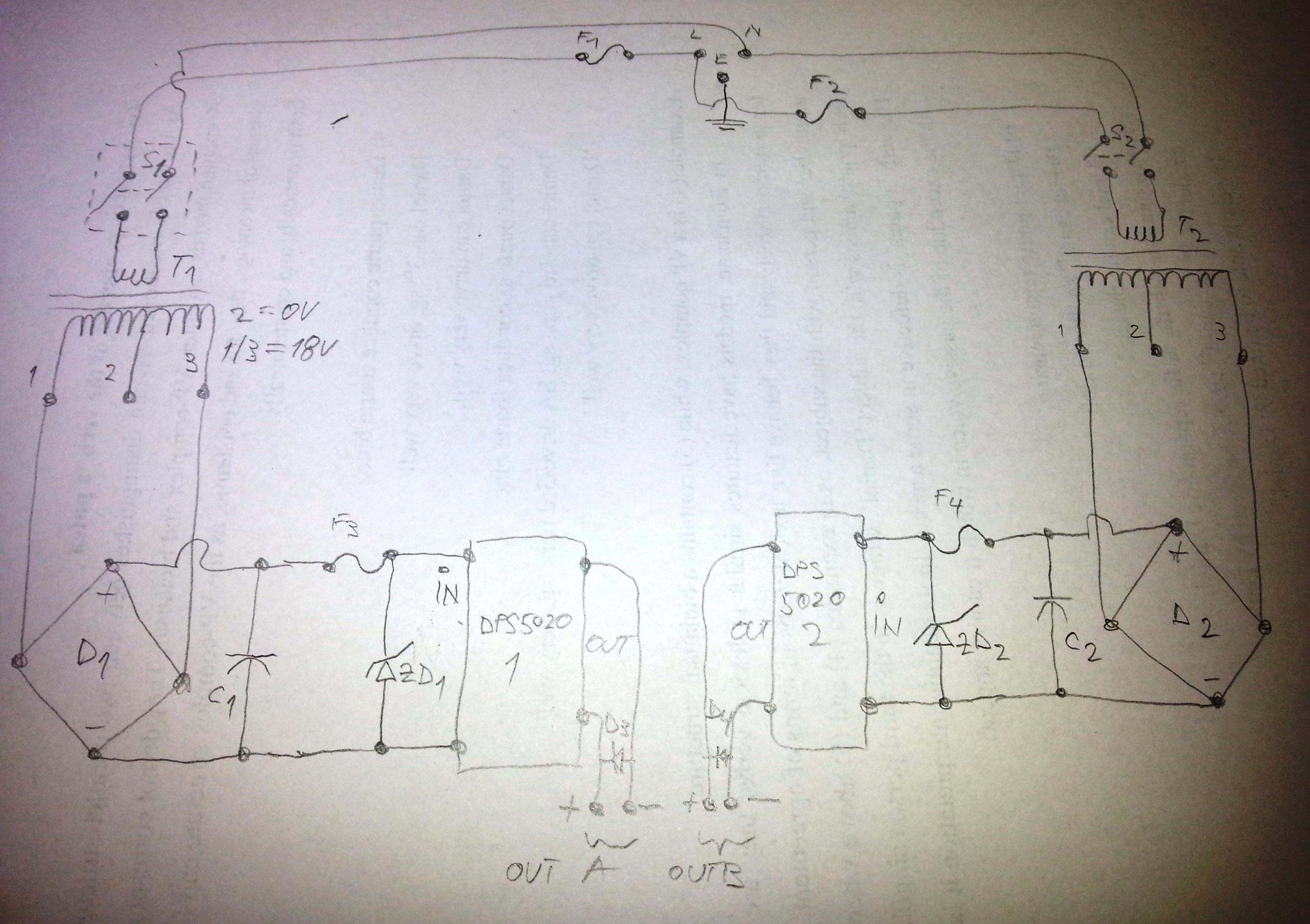 I laid down a wiring diagram, although it's very simple: there's two circuits side by side, perfectly identical, to form a dual-output bench supply. This way I can have two completely isolated supplies or I can join their GNDs together to have a common-GND dual-output supply which is handy for testing devices which require more than one power rail (12v-5v for instance). That's the theory at least.
